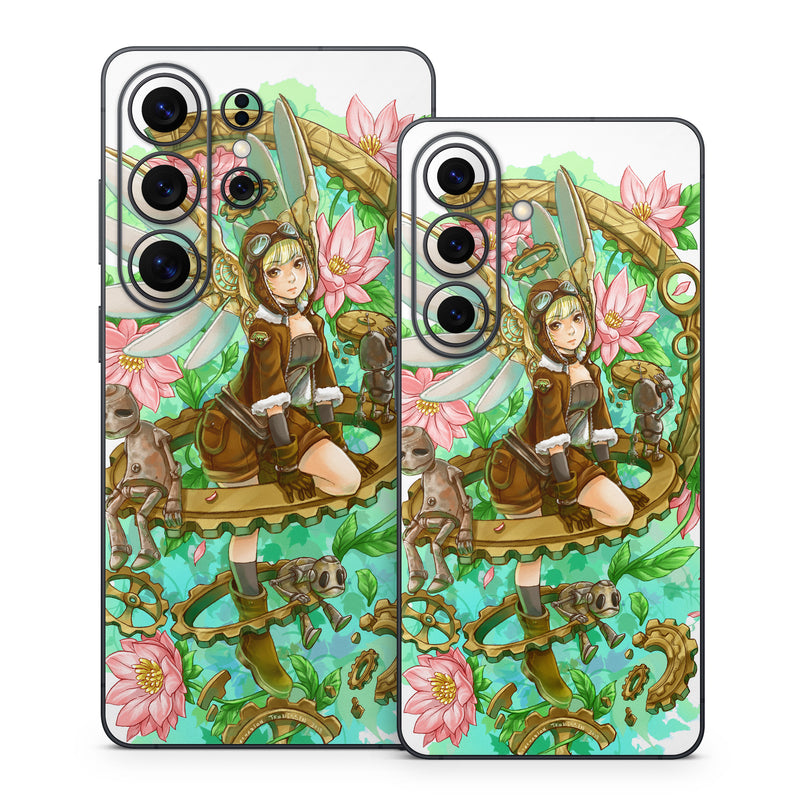 iStyles Samsung Galaxy S26 Series Skin design of Illustration, Fictional character, Clip art, Art, Graphics, Plant, with white, yellow, pink, green, brown, black colors, and tagged with people, fineart, fantasy, flowers, objects, angel, flowers, gear, gears, girl, pinup, pinupgirl, punk, steampunk, tinker.