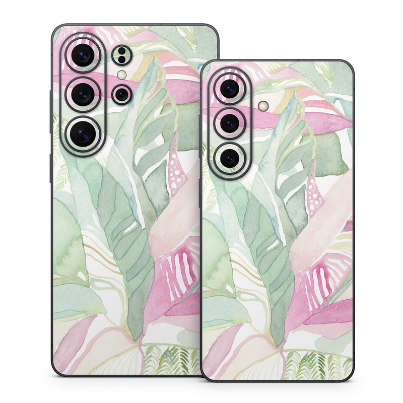 iStyles Samsung Galaxy S26 Series Skin design of Pink, Leaf, Botany, Pattern, Plant, Flower, Illustration, with white, green, pink, orange colors, and tagged with patterns, abstract, nature, beach, palmleaves, palmtrees, spring, summer, tropical, tropics.