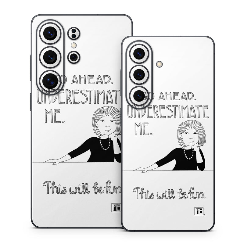 iStyles Samsung Galaxy S26 Series Skin design of Gesture, Happy, Font, Illustration, Poster, Line art, Graphics, Art, Logo, Graphic design, with black, white colors, and tagged with signs, people, confidence, attitude, go, ahead, underestimate, me, this, will, be, fun.