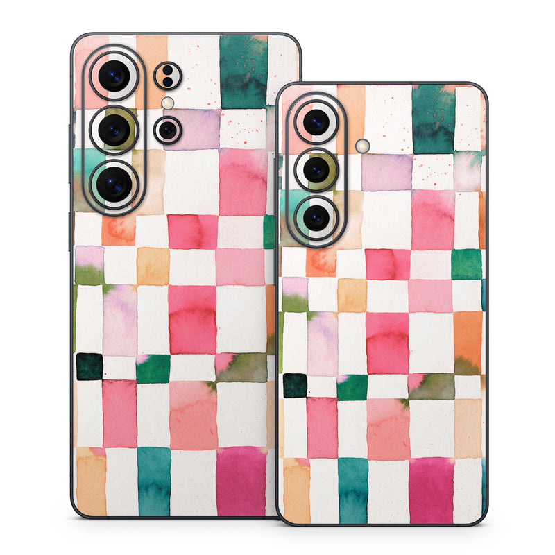 iStyles Samsung Galaxy S26 Series Skin design of Brown, Rectangle, Product, Textile, Art, Pink, Line, Aqua, Magenta, Symmetry, with white, pink, green, red, blue, orange, purple colors, and tagged with patterns, checkers, geometric, pattern, shapes, squares, watercolor.