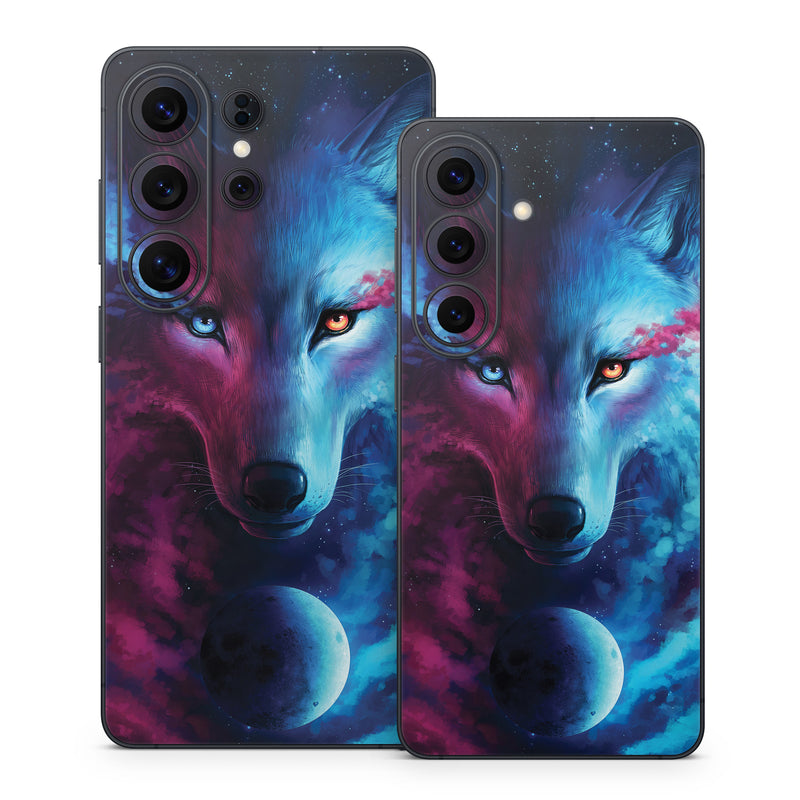 iStyles Samsung Galaxy S26 Series Skin design of Dog, Carnivore, Organism, Iris, Painting, Art, Whiskers, Cg artwork, Electric blue, Space, with black, blue, purple, red colors, and tagged with animals, space, blue, moon, purple, sky, wolf.