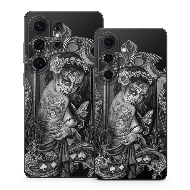 iStyles Samsung Galaxy S26 Series Skin design of Style, Art, Monochrome, Black-and-white, Monochrome Photography, Visual Arts, Illustration, Painting, Drawing, with black, white, gray colors, and tagged with skulls, people, animals, flowers, objects, bride, girl, goth, gothic, lady, skull, sugarskull, tattoo, tattoos, woman.