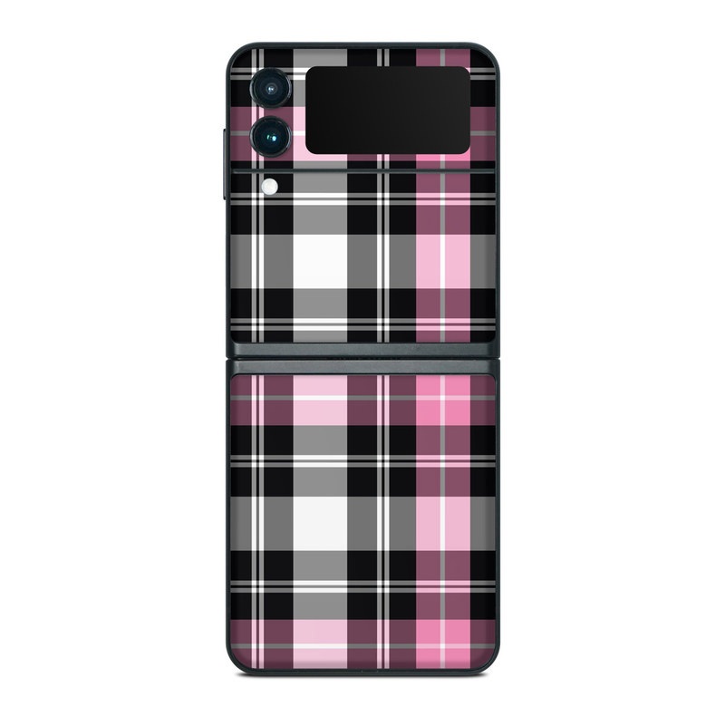 iStyles Samsung Galaxy Z Flip3 Skin design of Plaid, Tartan, Pattern, Pink, Purple, Violet, Line, Textile, Magenta, Design, with black, gray, pink, red, white, purple colors, and tagged with patterns.