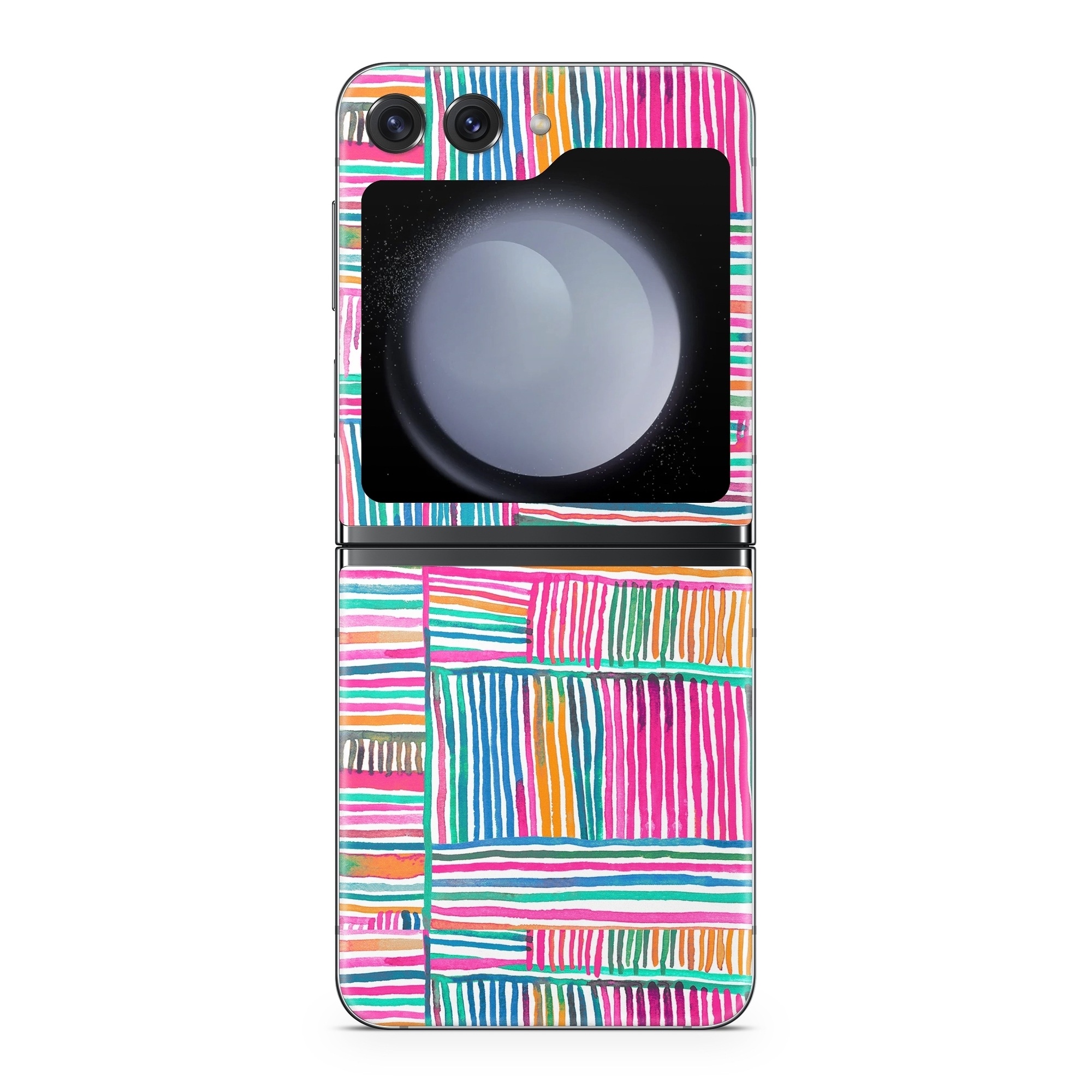 iStyles Samsung Galaxy Z Flip5 Skin design of Colorfulness, Product, Rectangle, Azure, Textile, Art, Aqua, Material property, Magenta, Tints and shades, with white, pink, orange, green, blue, yellow colors, and tagged with patterns, stripes, pattern.