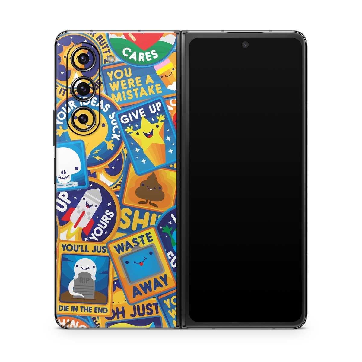 iStyles Samsung Galaxy Z Fold5 Skin design of Pattern, Visual arts, Design, Art, Mosaic, Psychedelic art, with blue, yellow, orange, white, green, red, gray colors, and tagged with patterns, signs, space, objects, hearts, fuck, funny, humor.