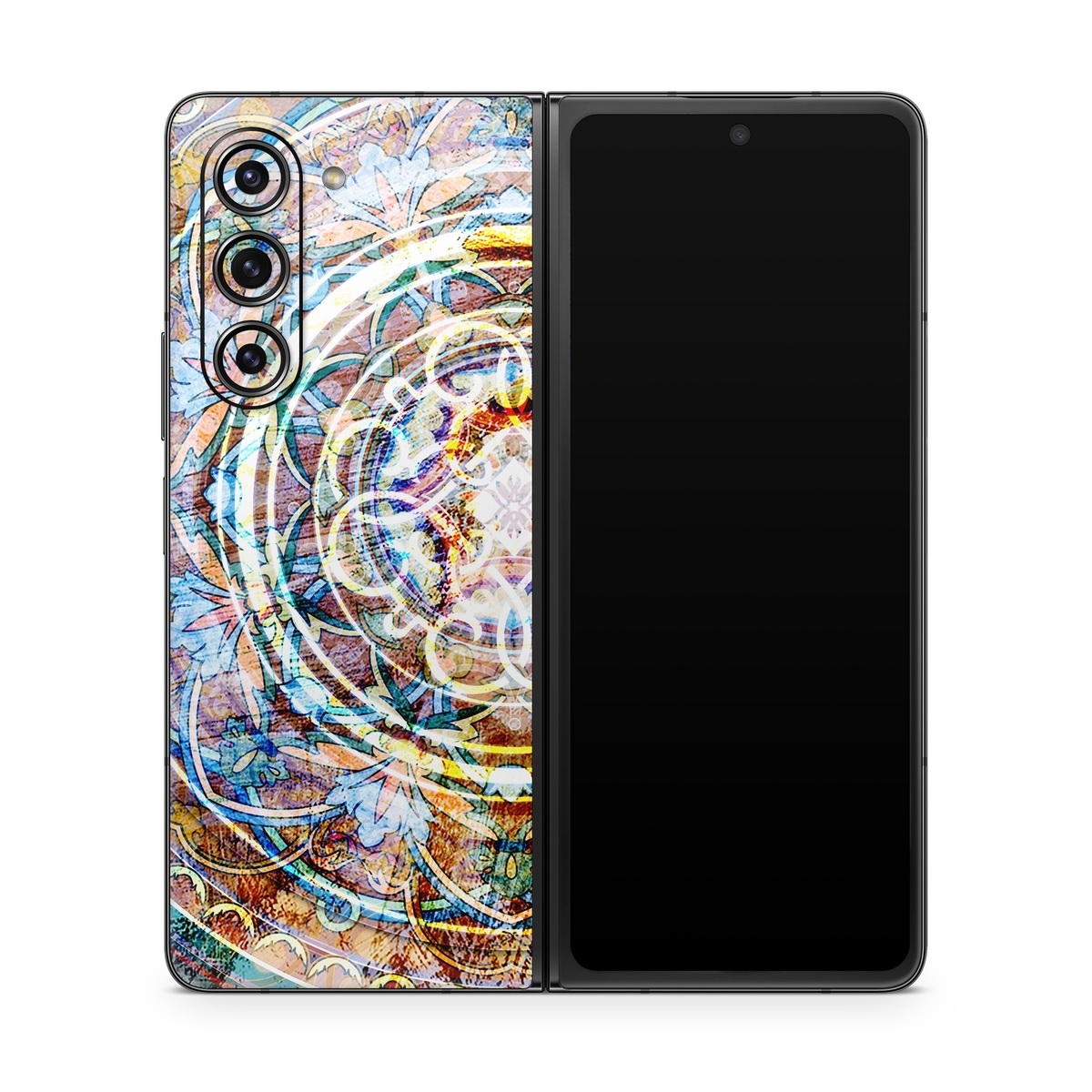 iStyles Samsung Galaxy Z Fold5 Skin design of Circle, Ceramic, Tableware, with yellow, red, orange, white, blue, green, gray colors, and tagged with patterns, objects, aztec, medallion, tribal.