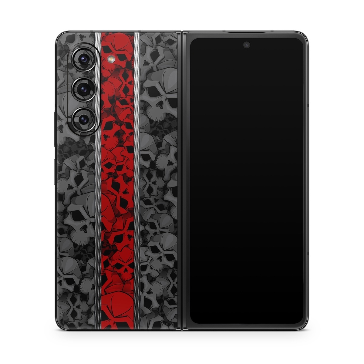 iStyles Samsung Galaxy Z Fold5 Skin design of Font, Text, Pattern, Design, Graphic design, Black-and-white, Monochrome, Graphics, Illustration, Art, with black, red, gray colors, and tagged with skulls, patterns.