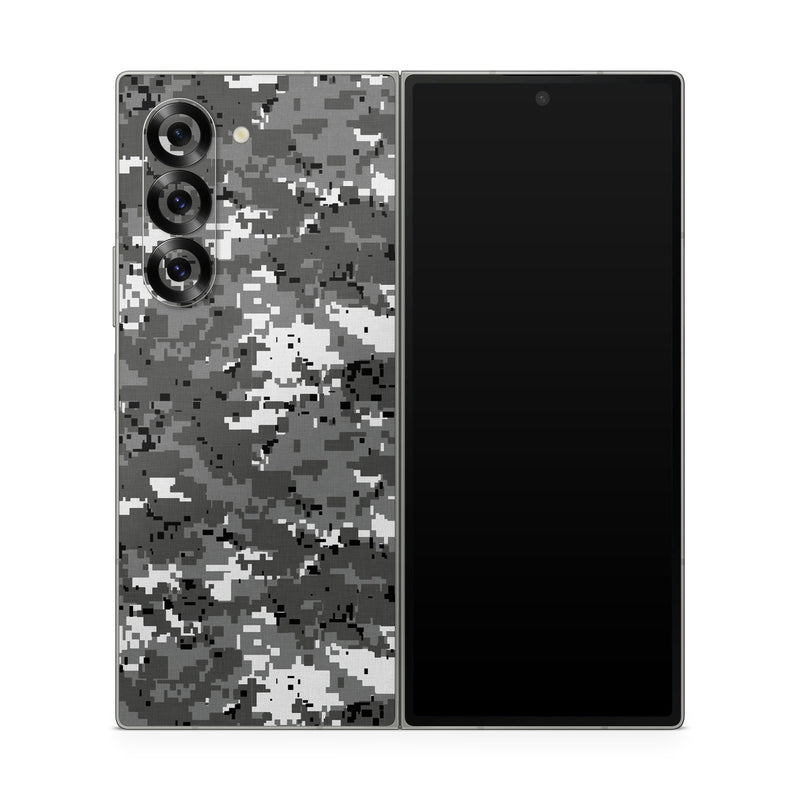 iStyles Samsung Galaxy Z Fold6 Skin design of Military camouflage, Pattern, Camouflage, Design, Uniform, Metal, Black-and-white, with black, gray colors, and tagged with military, lookslike, patterns.