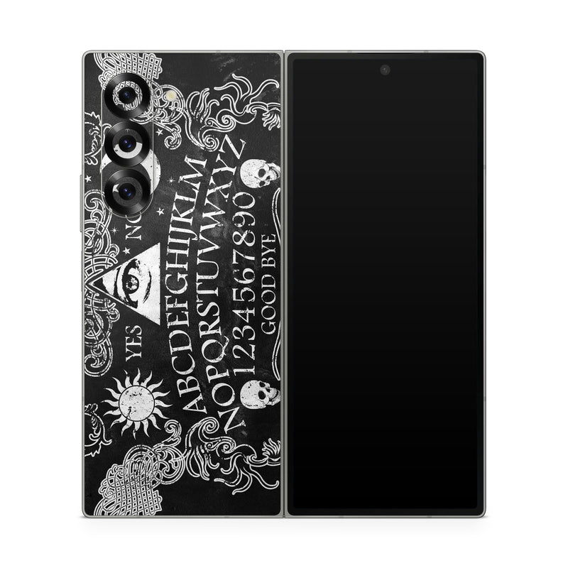 iStyles Samsung Galaxy Z Fold6 Skin design of Text, Font, Pattern, Design, Illustration, Headpiece, Tiara, Black-and-white, Calligraphy, Hair accessory, with black, white, gray colors, and tagged with signs, skulls, black, demons, ghosts, magic, magick, paranormal, skull, spirit, talking.