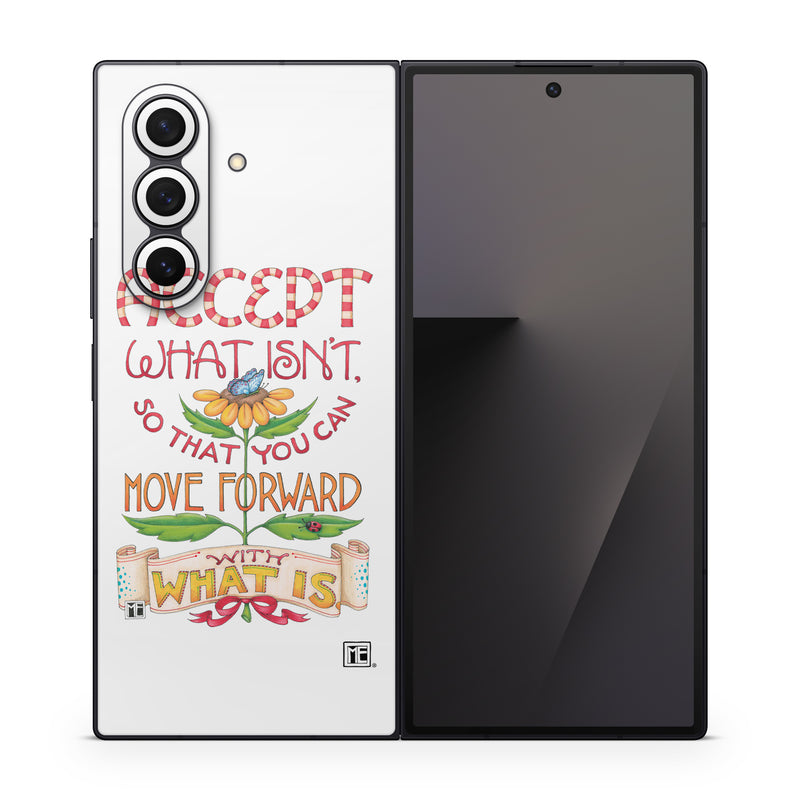 iStyles Samsung Galaxy Z Fold7 Skin design of Butterfly, Sun-Flower, Leaves, with white, red, green, brown, yellow, blue, orange, black colors, and tagged with signs, flowers, animals, flower, garden, motivation, quote, quotes, sayings, words.