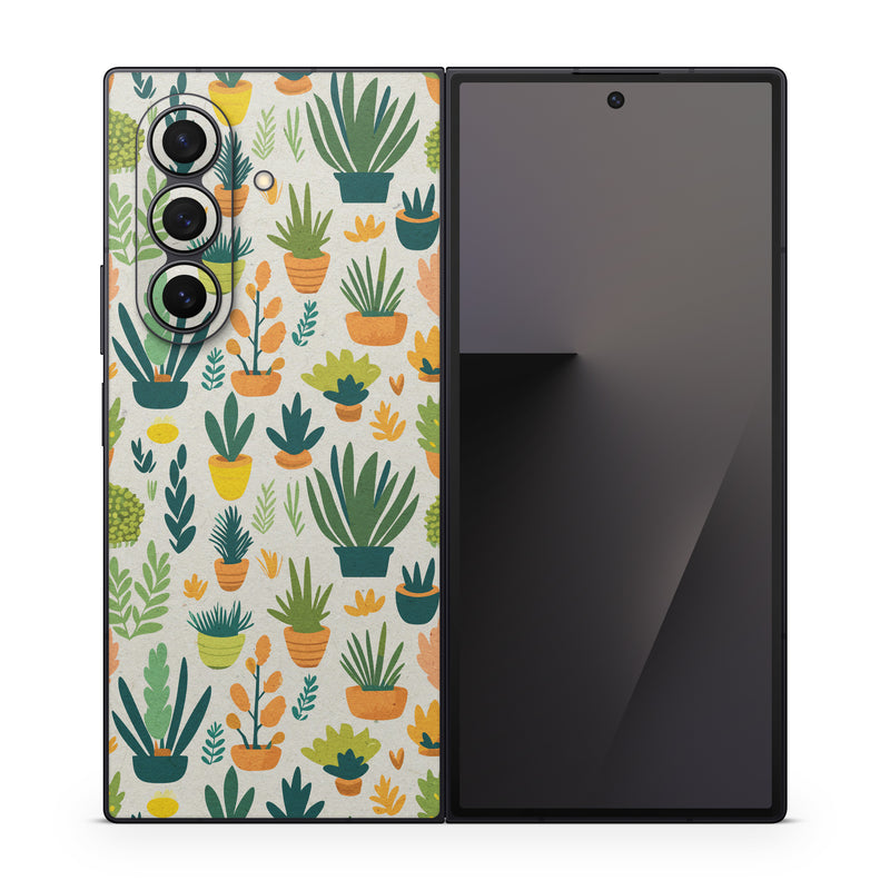 iStyles Samsung Galaxy Z Fold7 Skin design of Flower, Plant, Petal, Textile, Botany, Art, Creative arts, Flowering plant, Porcelain, Groundcover, with white, green, brown, yellow, orange colors, and tagged with patterns, objects, nature, plants, pots, gardening, pattern.