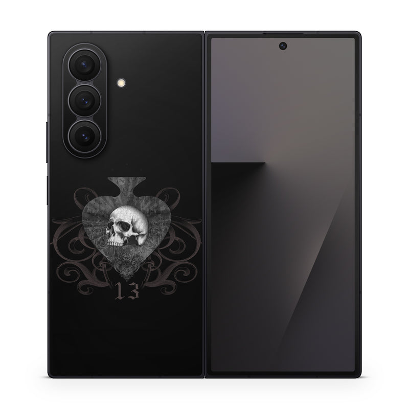 iStyles Samsung Galaxy Z Fold7 Skin design of Bone, Jaw, Grey, Art, Skull, Font, Darkness, Monochrome photography, Illustration, Monochrome, with black, white, brown colors, and tagged with skulls, signs, patterns, fantasy, skull, thirteen, spade.