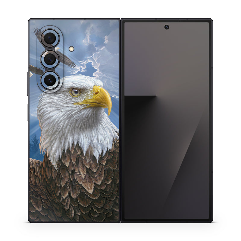 iStyles Samsung Galaxy Z Fold7 Skin design of Bird, Bald eagle, Bird of prey, Vertebrate, Accipitriformes, Accipitridae, Eagle, Nature, Beak, Kite, with blue, brown, white, yellow colors, and tagged with animals, nature, america, animals, birds, eagle, nature.