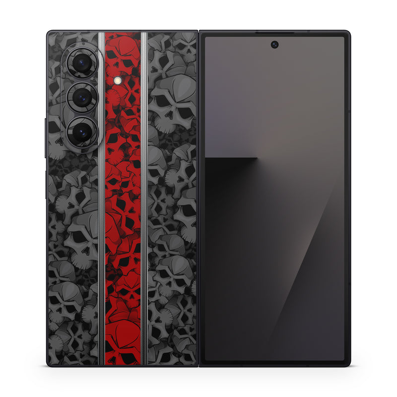 iStyles Samsung Galaxy Z Fold7 Skin design of Font, Text, Pattern, Design, Graphic design, Black-and-white, Monochrome, Graphics, Illustration, Art, with black, red, gray colors, and tagged with skulls, patterns.