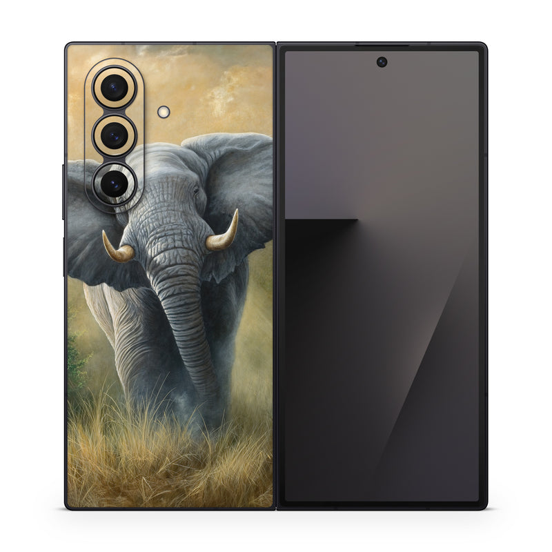 iStyles Samsung Galaxy Z Fold7 Skin design of Terrestrial animal, Elephants and Mammoths, Vertebrate, Wildlife, Mammal, African elephant, Indian elephant, Grassland, Working animal, Tusk, with gray, white, green, brown, yellow, orange colors, and tagged with animals, nature, fineart, animals, elephant.