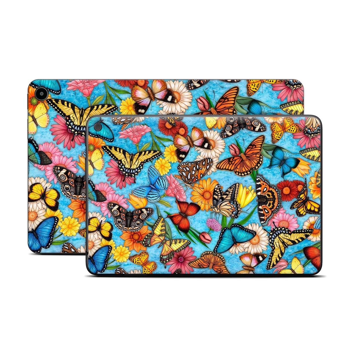 iStyles Amazon Fire Tablet Series Skin design of Cynthia (subgenus), Butterfly, Monarch butterfly, Moths and butterflies, Brush-footed butterfly, Pollinator, Insect, Pattern, Design, Organism, with blue, pink, orange, yellow, red colors, and tagged with flowers, patterns, animals.
