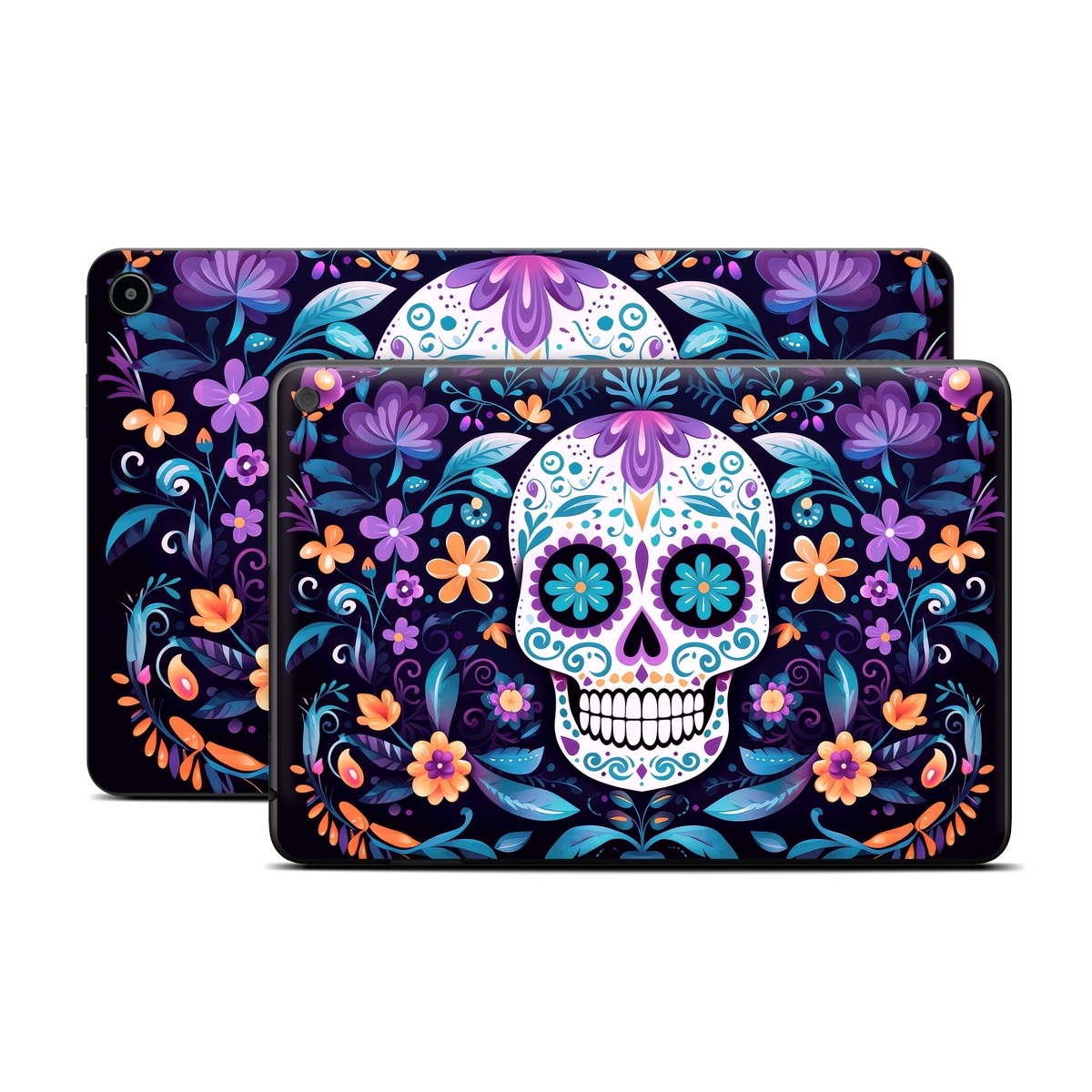 iStyles Amazon Fire Tablet Series Skin design of Textile, Petal, Aqua, Art, Symmetry, Flower, Pattern, Circle, Magenta, Electric blue, with yellow, orange, red, black, white, blue, purple colors, and tagged with skulls, flowers, halloween, flowers, skull, leaves.