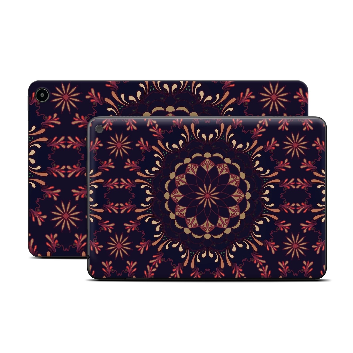 iStyles Amazon Fire Tablet Series Skin design of Pattern, Brown, Red, Symmetry, Textile, Design, Visual arts, Tapestry, Kaleidoscope, with black, red, orange, yellow, brown colors, and tagged with patterns, flowers, boho, filigree, kaleidoscope, mandala.