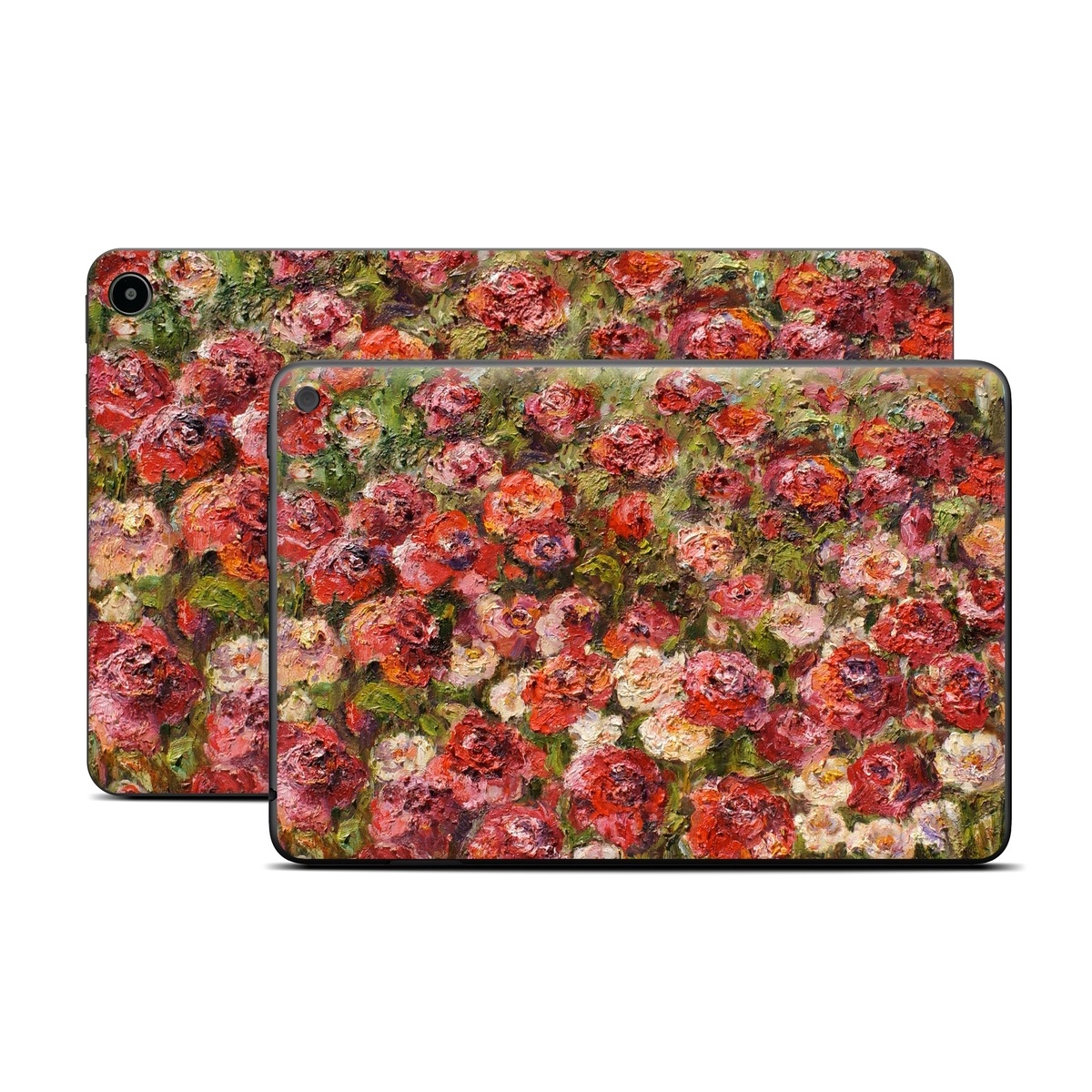 iStyles Amazon Fire Tablet Series Skin design of Flower, Garden roses, Rose, Plant, Floribunda, Flowering plant, Rosa × centifolia, Rose family, Botany, Petal, with red, black, green, gray colors, and tagged with flowers, fineart.