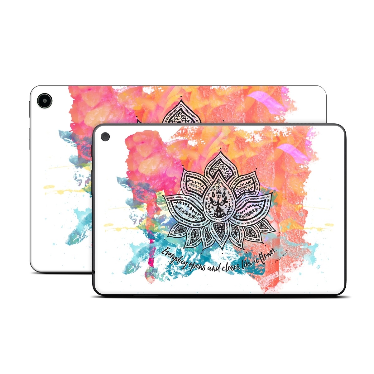 iStyles Amazon Fire Tablet Series Skin design of Pink, Leaf, Pattern, Design, Graphic design, Illustration, Symmetry, Visual arts, Art, Plant, with orange, yellow, red, blue, green, black colors, and tagged with signs, flowers, colorful, flower, lotus.
