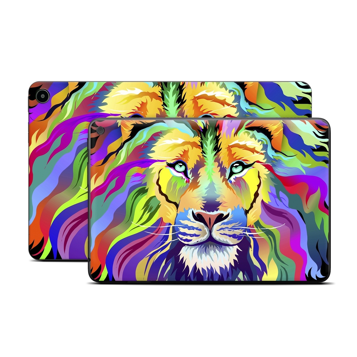iStyles Amazon Fire Tablet Series Skin design of Bengal tiger, Felidae, Lion, Wildlife, Big cats, Tiger, Carnivore, Art, Illustration, Painting, with orange, yellow, green, red, pink, blue, purple colors, and tagged with animals.