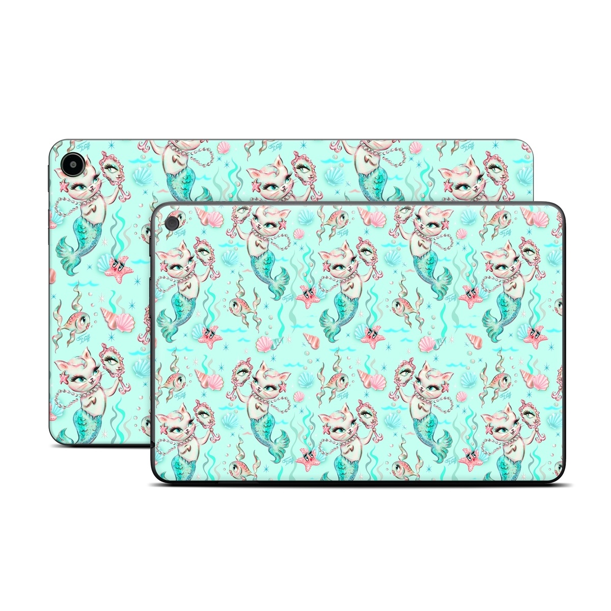 iStyles Amazon Fire Tablet Series Skin design of Green, Aqua, Pattern, Teal, Turquoise, Pink, Textile, Wrapping paper, Design, with blue, pink, white, green colors, and tagged with patterns, animals, fantasy, objects, animals, cat, kitten, kittens, mermaid, mermaids, ocean, pastel, pattern, sea, sealife.
