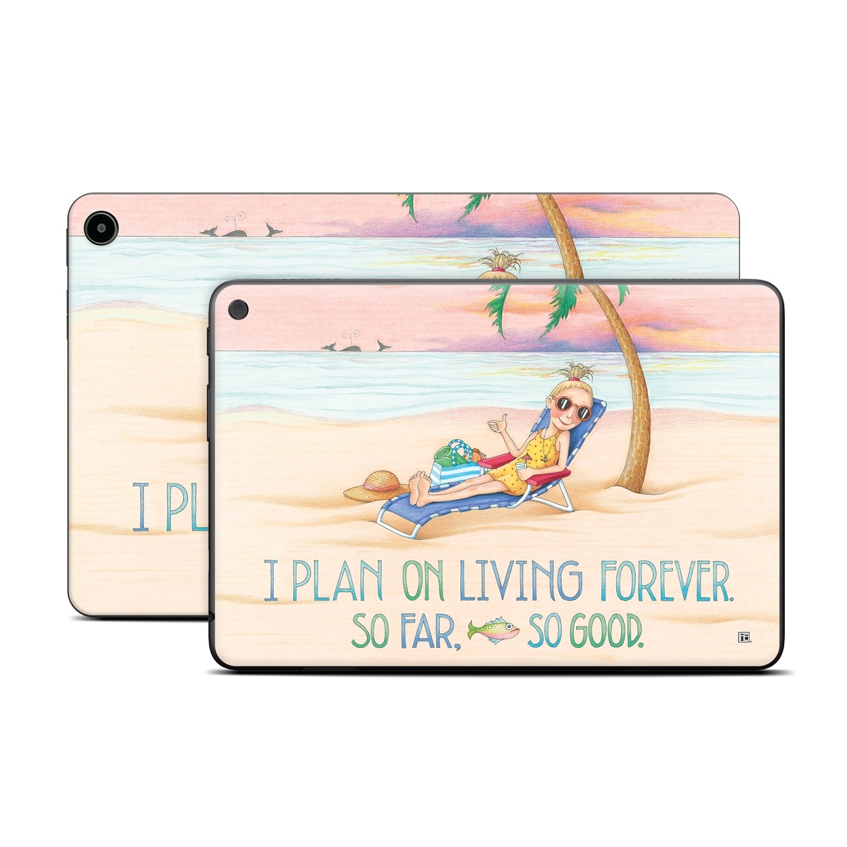 iStyles Amazon Fire Tablet Series Skin design of Vacation, Product, Summer, Aqua, Illustration, Sun tanning, Fictional character, Caribbean, Graphics, Happy, with pink, green, brown, yellow, blue, white, red colors, and tagged with signs, people, animals, beach, humor, ocean, palmtree.