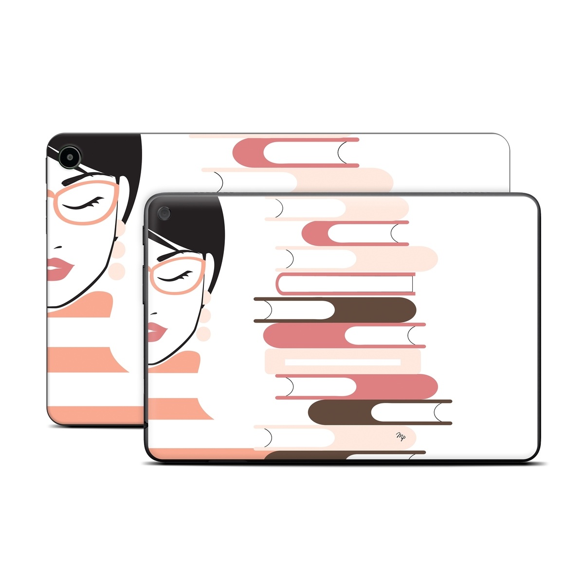iStyles Amazon Fire Tablet Series Skin design of Eyebrow, Gesture, Font, Carmine, Graphics, Thumb, Art, Illustration, Graphic design, Lipstick, with white, black, pink, brown, red colors, and tagged with objects, people, patterns, reading, girl, spectacles.