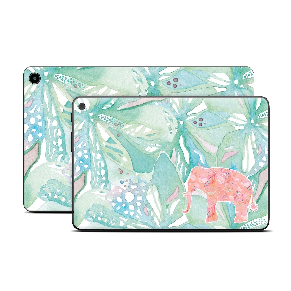 iStyles Amazon Fire Tablet Series Skin design of Aqua, Turquoise, Pattern, Wrapping paper, Design, Illustration, Plant, Gift wrapping, Art, with blue, pink, white, green colors, and tagged with abstract, animals, flowers, animals, blue, bright, elephant, floral, flowers, pink, plants, tropical, watercolor.
