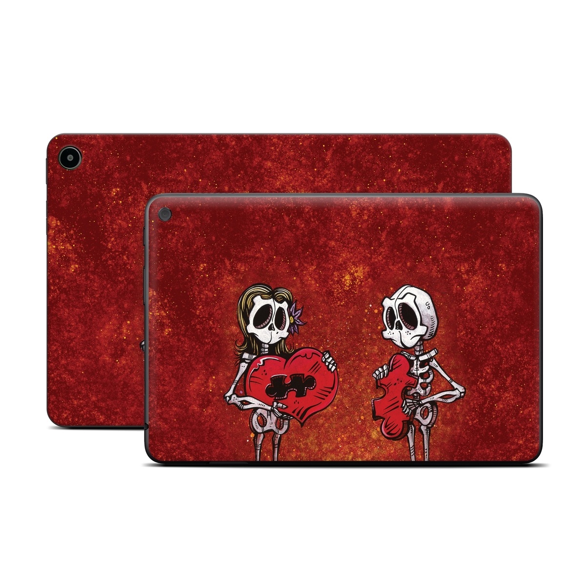 iStyles Amazon Fire Tablet Series Skin design of Font, Tints and shades, Bone, Art, Skull, Pattern, Creative arts, Carmine, Visual arts, Rectangle, with white, black, gray, brown, red, yellow, orange colors, and tagged with skulls, hearts, love, couple, perfect.