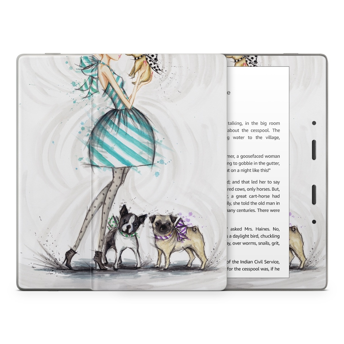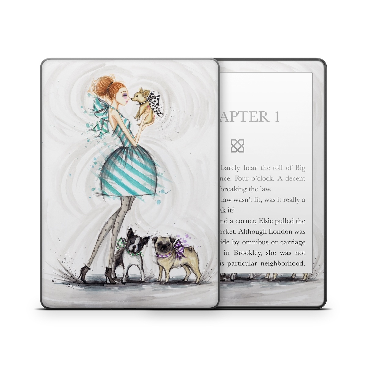 iStyles Amazon Kindle Series Skin design of Illustration, Cartoon, Drawing, Art, Costume design, Fictional character, Fashion illustration, Sketch, with gray, black, white, blue, gray, yellow, brown colors, and tagged with people, fineart, animals, fashion, animals, bulldog, chihuahua, dogs, dresses, fashion, frenchbulldog, pug.