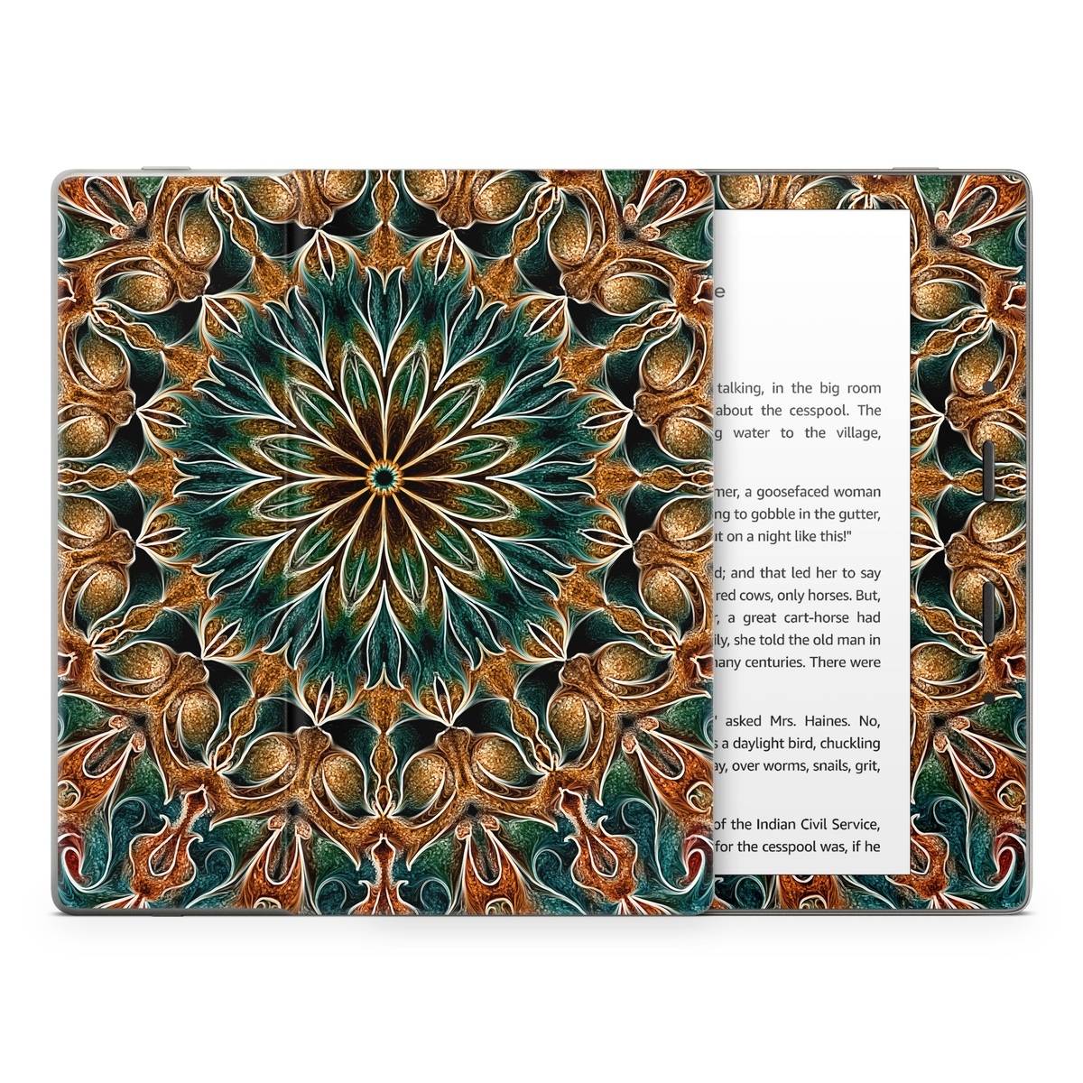 iStyles Amazon Kindle Series Skin design of Pattern, Symmetry, Textile, Art, Psychedelic art, Tapestry, Design, Visual arts, Kaleidoscope, Motif, with green, orange, yellow, brown, red colors, and tagged with patterns, abstract, orange, teal.