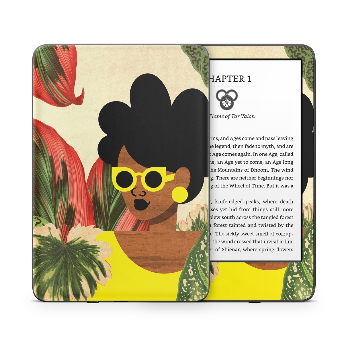 iStyles Amazon Kindle Series Skin design of Illustration, Plant, Botany, Organism, Leaf, Art, Animation, Grass, Flower, Perennial plant, with green, black, brown, yellow, red colors, and tagged with people, nature, flowers, floral, nature, people, plants, woman.