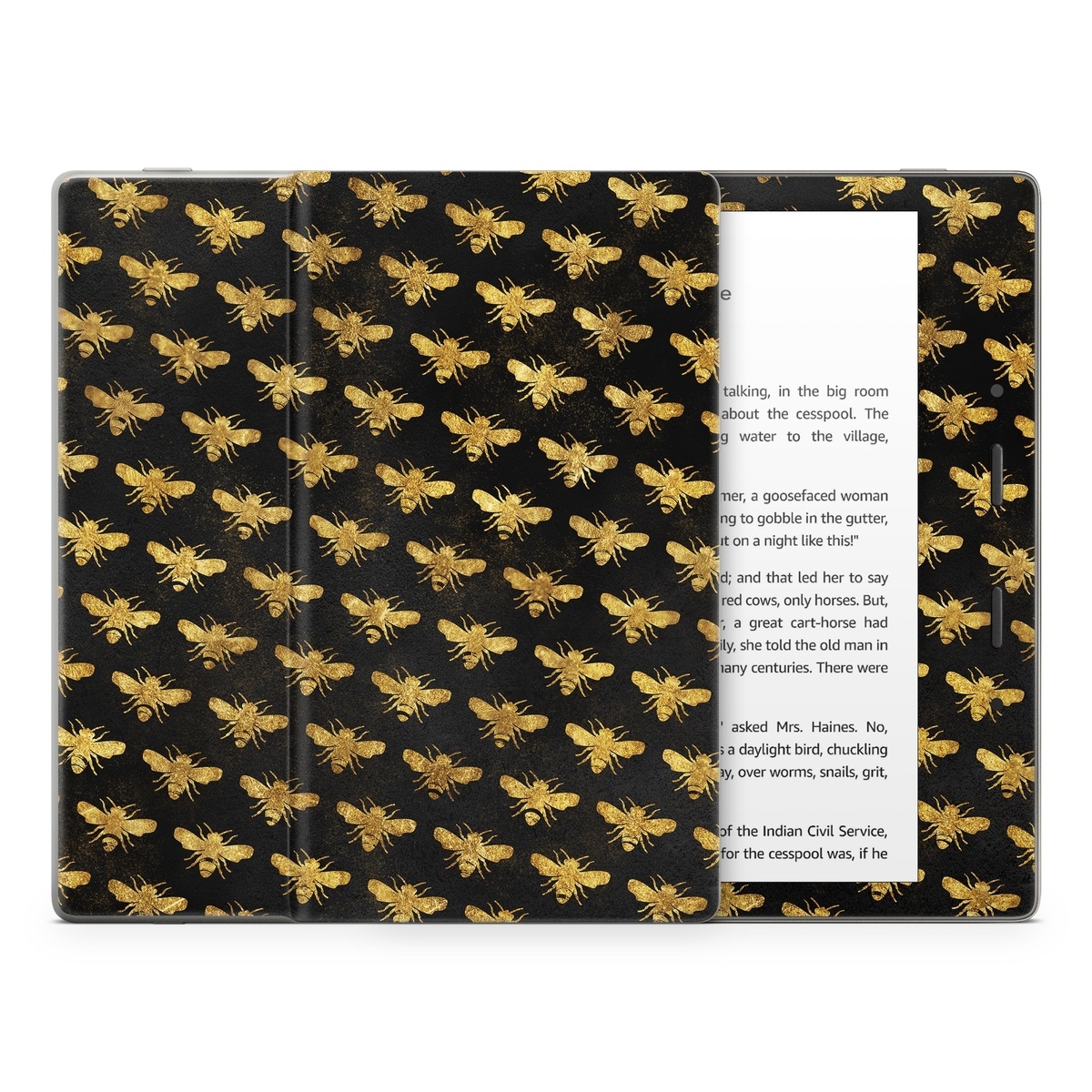 iStyles Amazon Kindle Series Skin design of Pattern, Yellow, Flower, Design, Plant, Wildflower, Textile, Metal, with black, yellow colors, and tagged with patterns, animals, bee, bees, bugs, fashion, gold, insect.