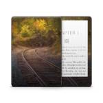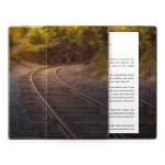 iStyles Amazon Kindle Series Skin design of Plant, Wood, Branch, Natural landscape, Road surface, Track, Grass, Tree, Thoroughfare, Twig, with brown, gray, yellow, orange, green, red colors, and tagged with nature, objects, nature, outdoors, photography, train, traintracks.