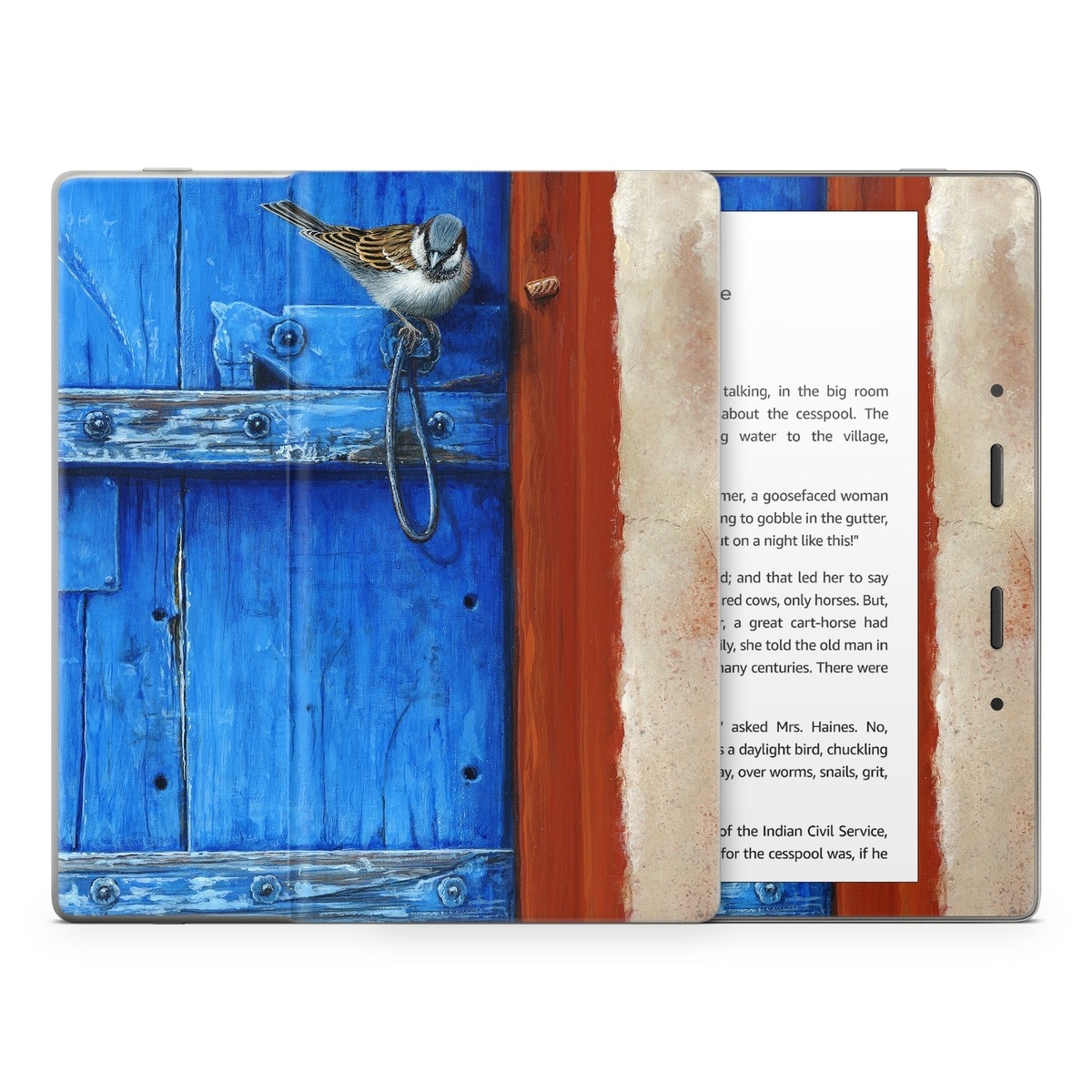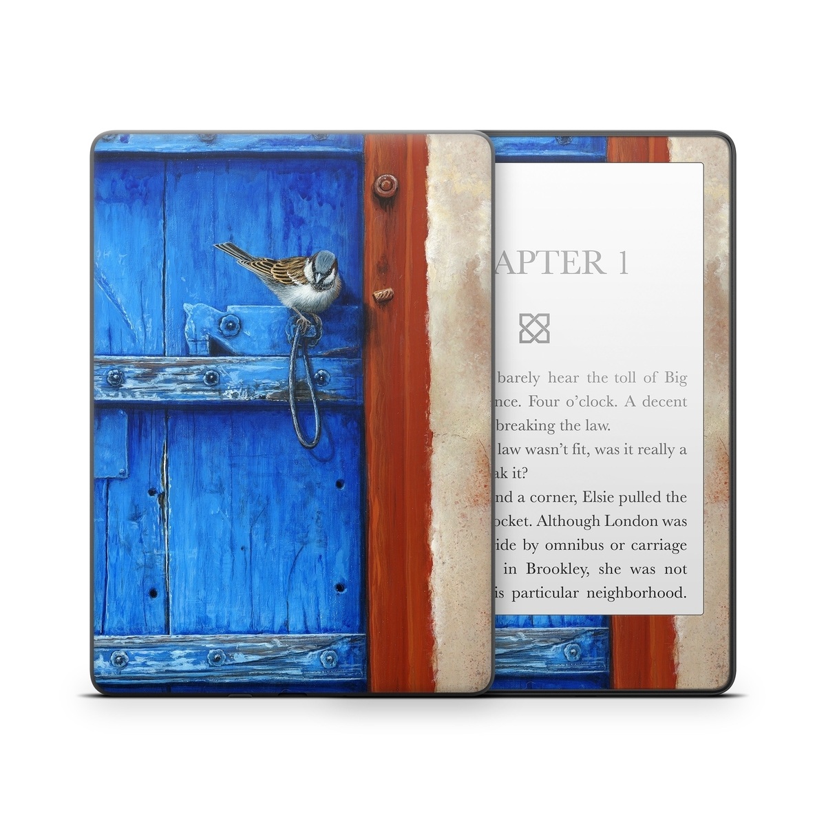 iStyles Amazon Kindle Series Skin design of Blue, Wood, Door handle, Door, Wall, Door knocker, Electric blue, Still life photography, Window, Handle, with red, blue, brown colors, and tagged with animals, fineart, animal, bird, birds, fineart, outdoors.