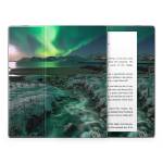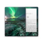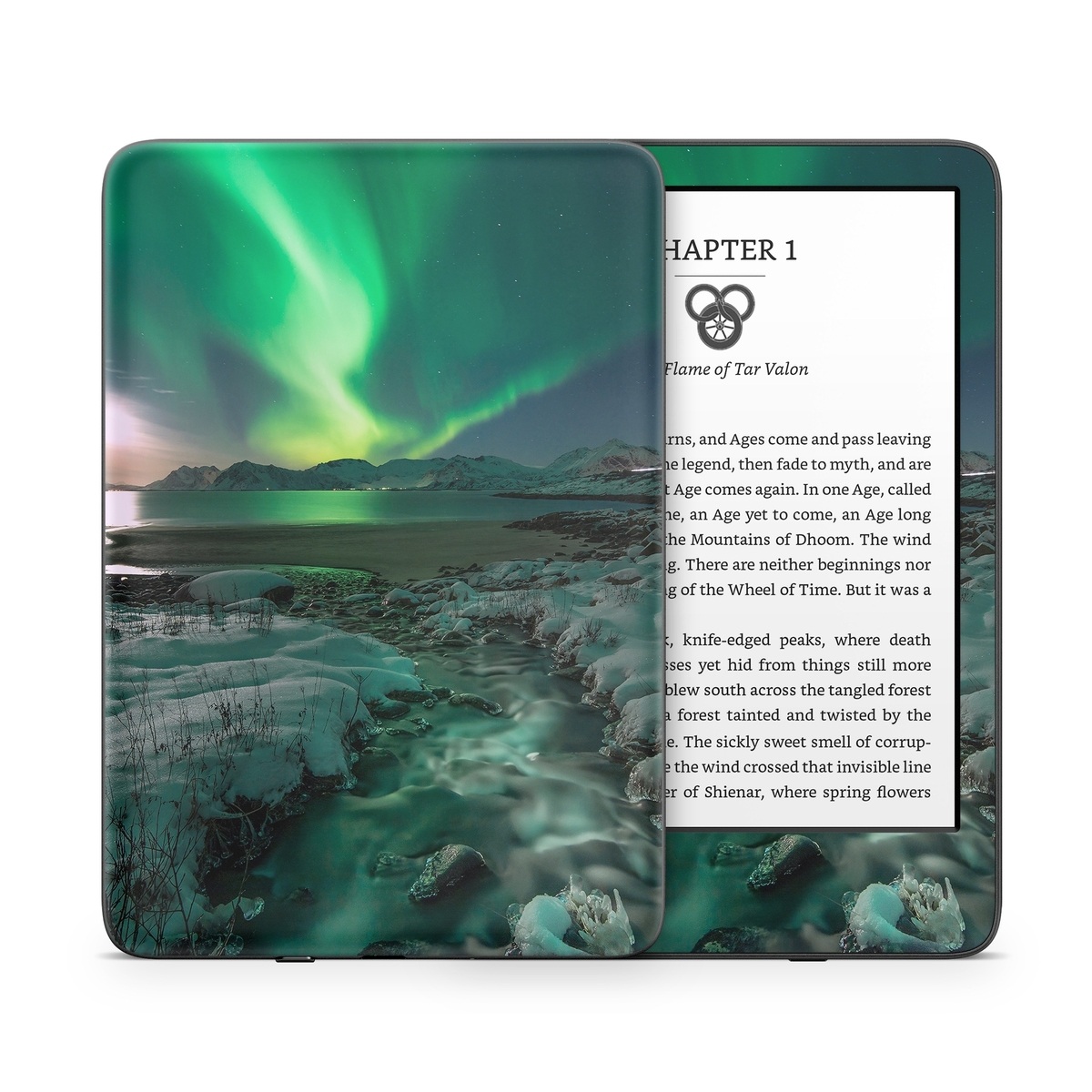 iStyles Amazon Kindle Series Skin design of Nature, Aurora, Sky, Geological phenomenon, Water, Atmosphere, Space, Landscape, World, Glacier, with white, green, blue, black, gray colors, and tagged with nature, photos, arctic, cold, mountains, northernlights, photography, snow.