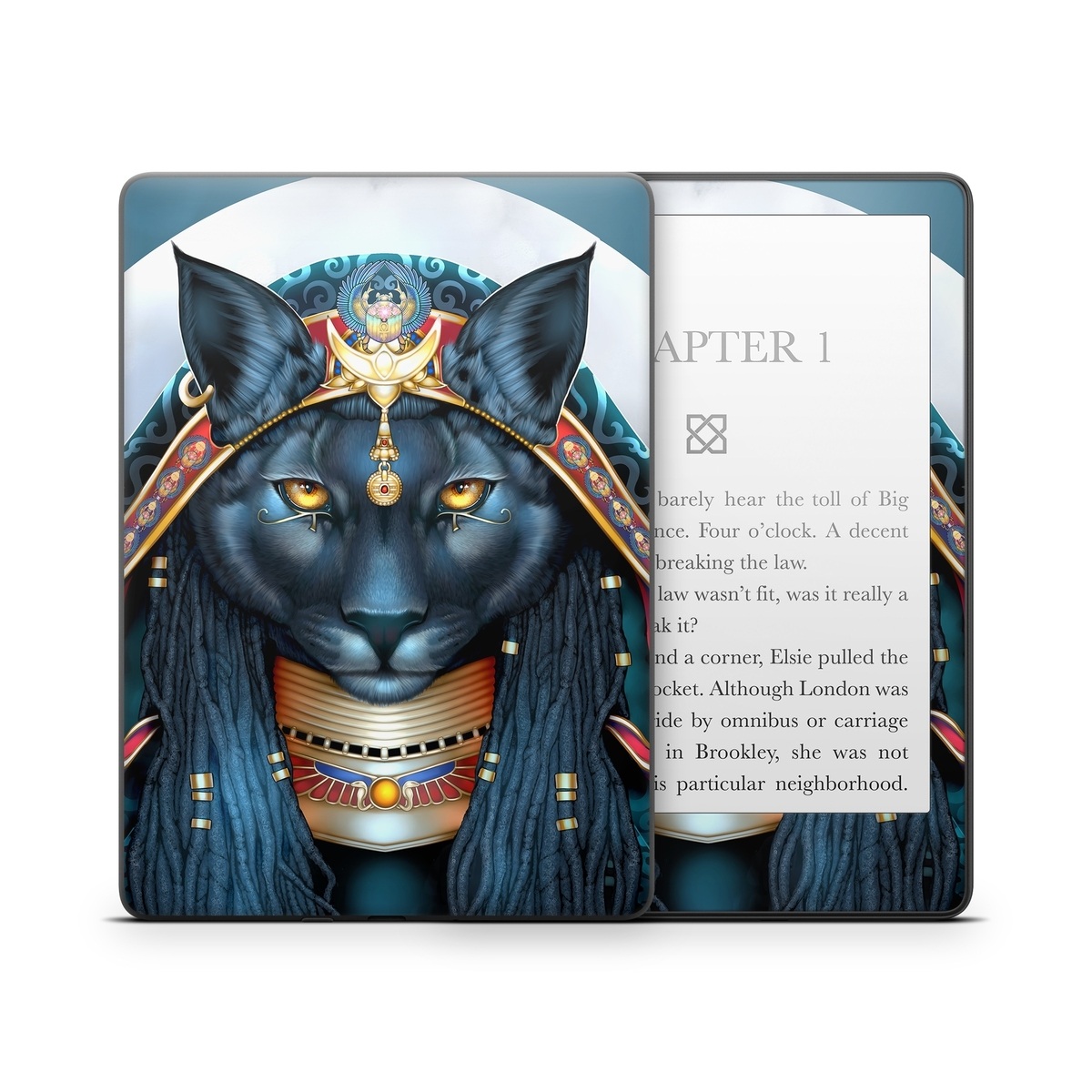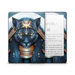 iStyles Amazon Kindle Series Skin design of Jaw, Font, Whiskers, Toy, Snout, Personal protective equipment, Fictional character, Electric blue, Graphics, Mask, with black, white, red, blue, yellow, orange colors, and tagged with fantasy, animals, signs, space, objects, panther, egyptian, moon.