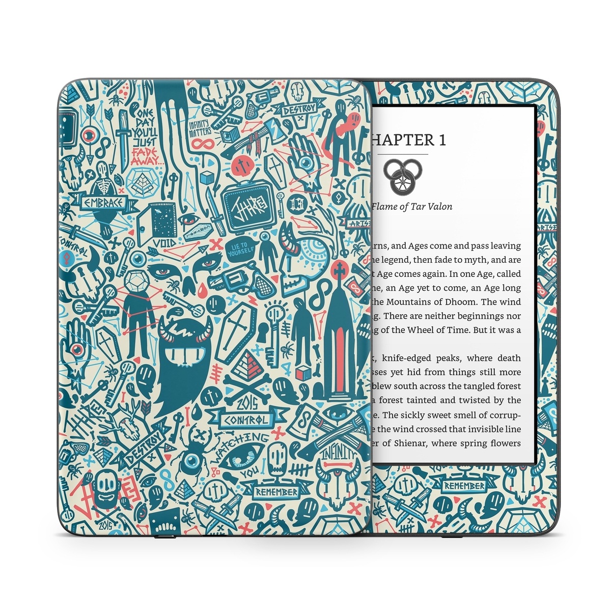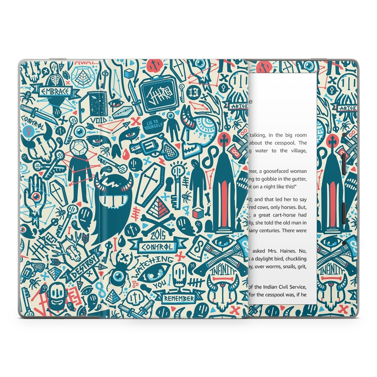 iStyles Amazon Kindle Series Skin design of Pattern, Psychedelic art, Turquoise, Art, Design, Visual arts, Line, Drawing, Doodle, Graphic design, with white, green, blue, red colors, and tagged with patterns, animals, people, objects, signs.