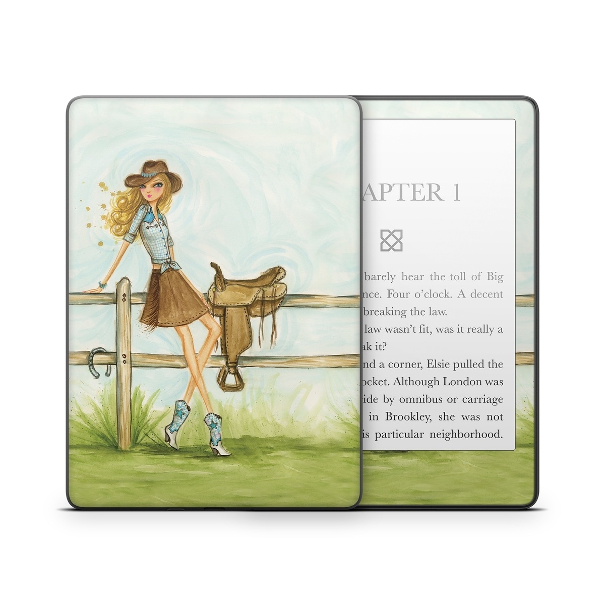 iStyles Amazon Kindle Series Skin design of Cartoon, Illustration, Art, Watercolor paint, Footwear, Fashion illustration, Grass, Drawing, Painting, Plant, with gray, green, red, black colors, and tagged with people, nature, objects.
