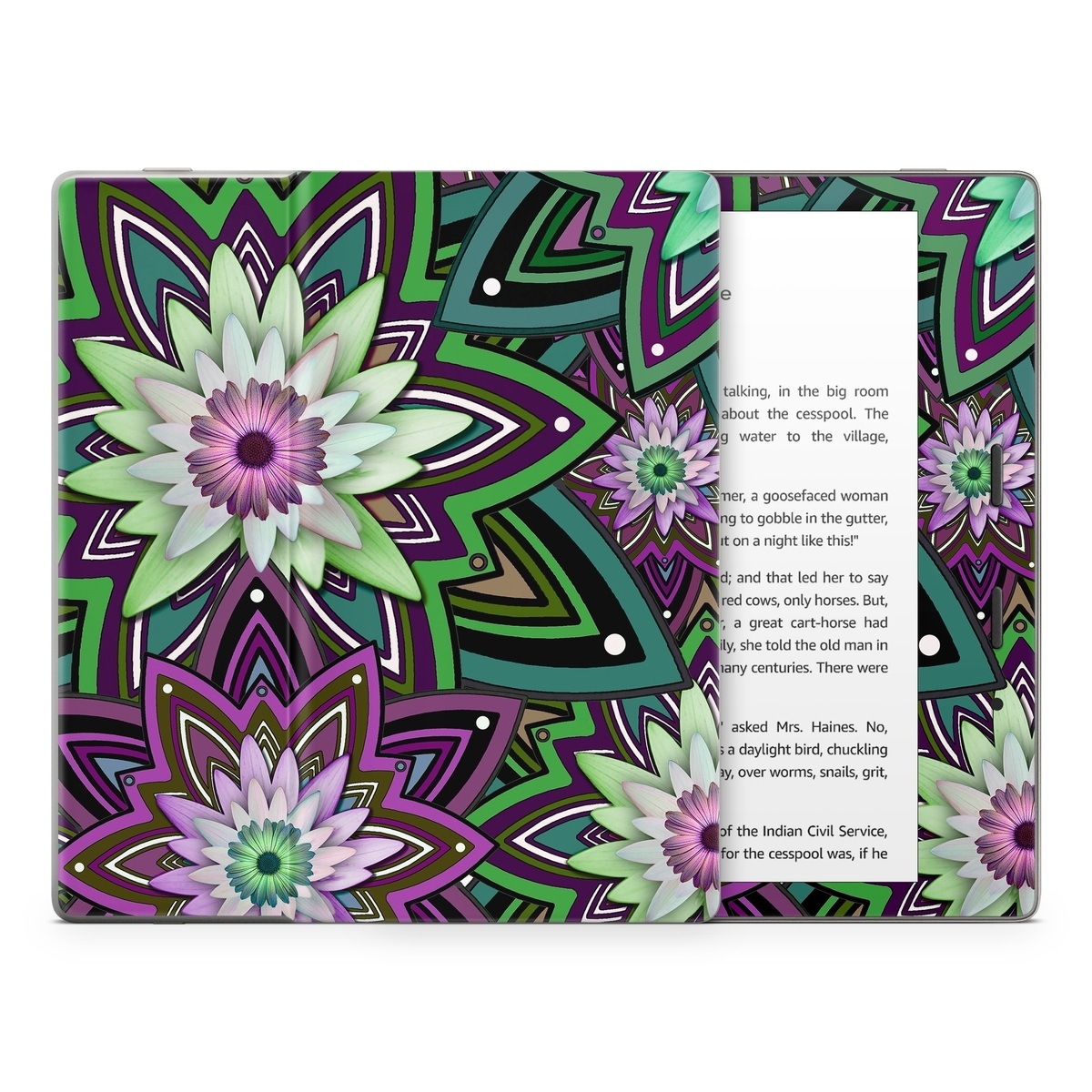iStyles Amazon Kindle Series Skin design of Pattern, Purple, Green, Flower, Psychedelic art, Design, Lilac, Plant, Symmetry, Visual arts, with black, gray, green, purple, blue, red colors, and tagged with patterns, flowers.