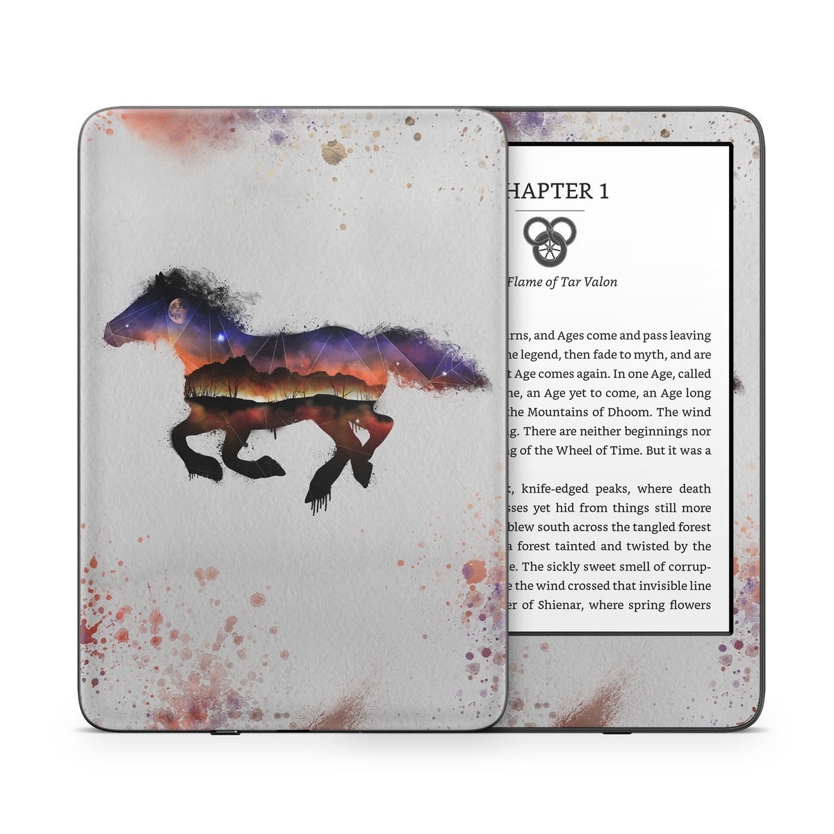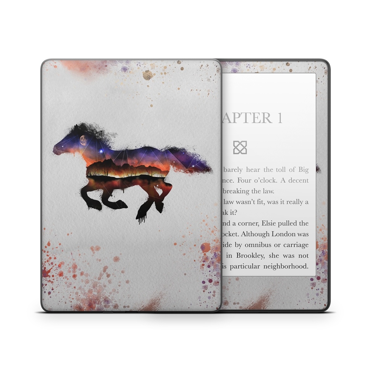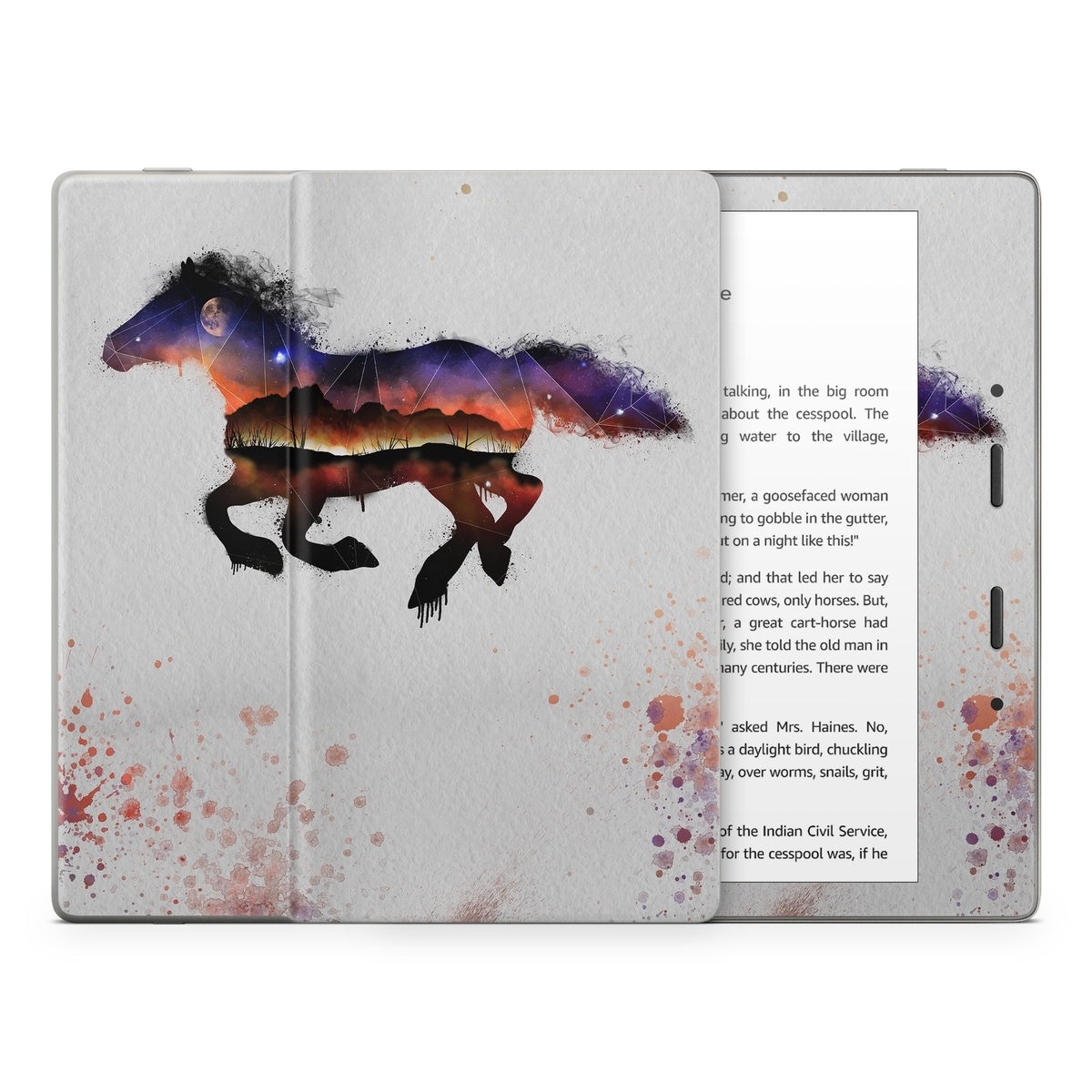 iStyles Amazon Kindle Series Skin design of Watercolor paint, Illustration, Art, Horse, Paint, Drawing, Graphic design, Painting, Visual arts, Mustang horse, with gray, white, purple, red, yellow, black, orange colors, and tagged with animals, nature, space, animals, horse, moon, nature, night, stars, watercolor.