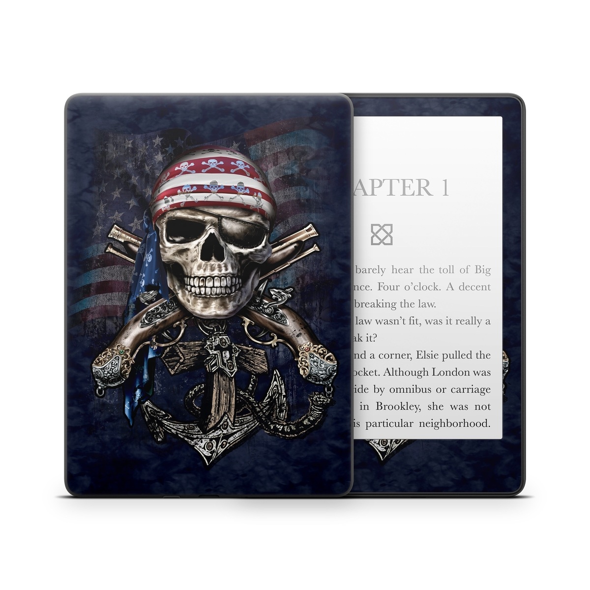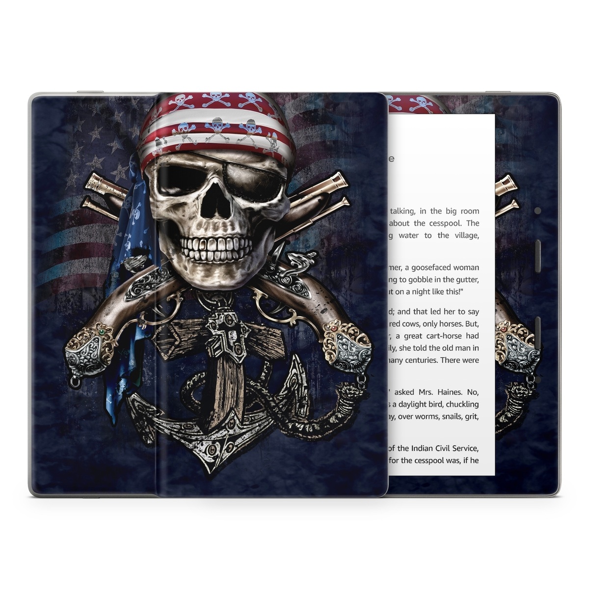 iStyles Amazon Kindle Series Skin design of Skull, Bone, Skeleton, Illustration, Outerwear, T-shirt, Flag, Art, with black, gray, red colors, and tagged with skulls, flags, objects.