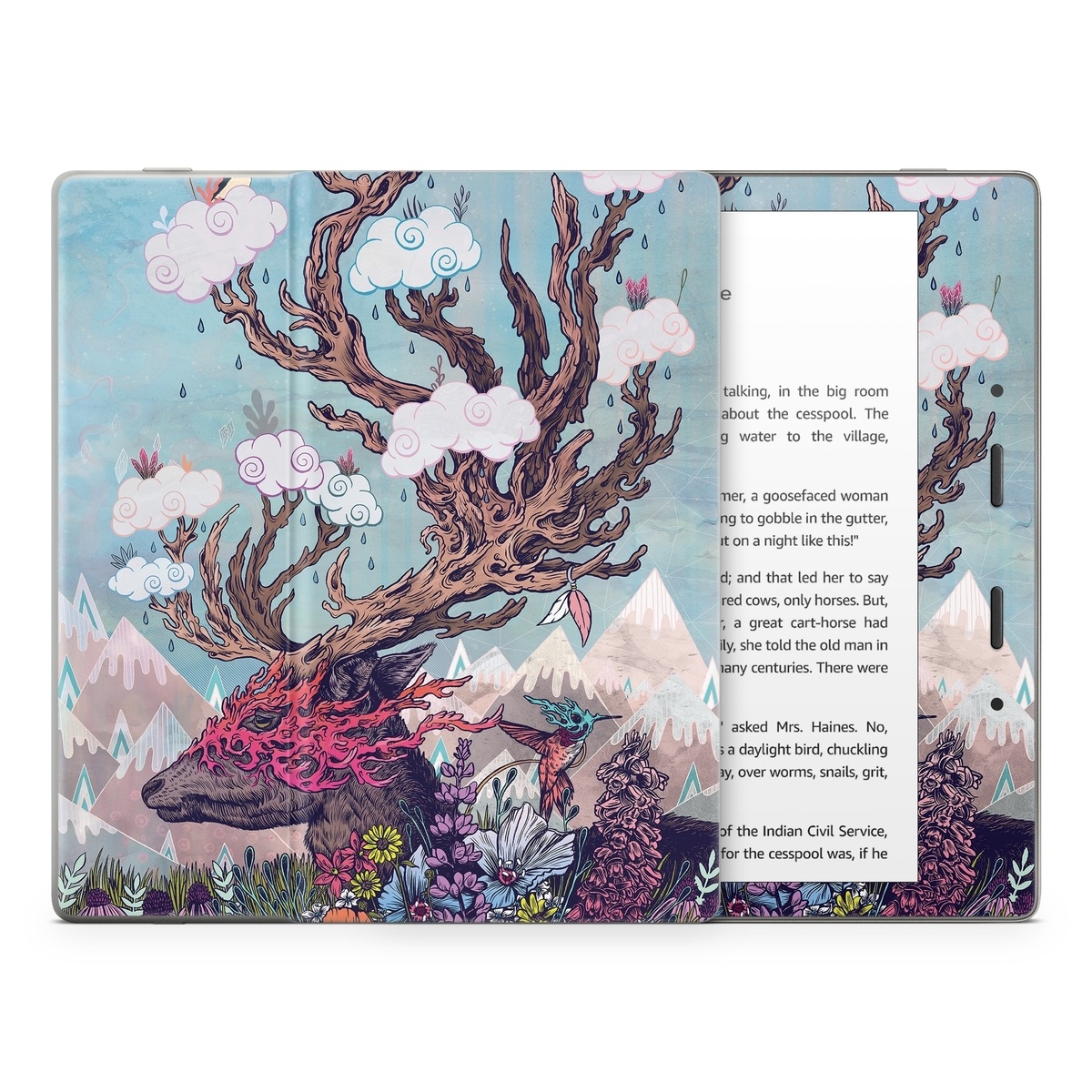 iStyles Amazon Kindle Series Skin design of Illustration, Tree, Watercolor paint, Painting, Art, Plant, Acrylic paint, Fictional character, Flower, Blossom, with gray, black, red, purple, blue colors, and tagged with animals, flowers, nature, abstract.