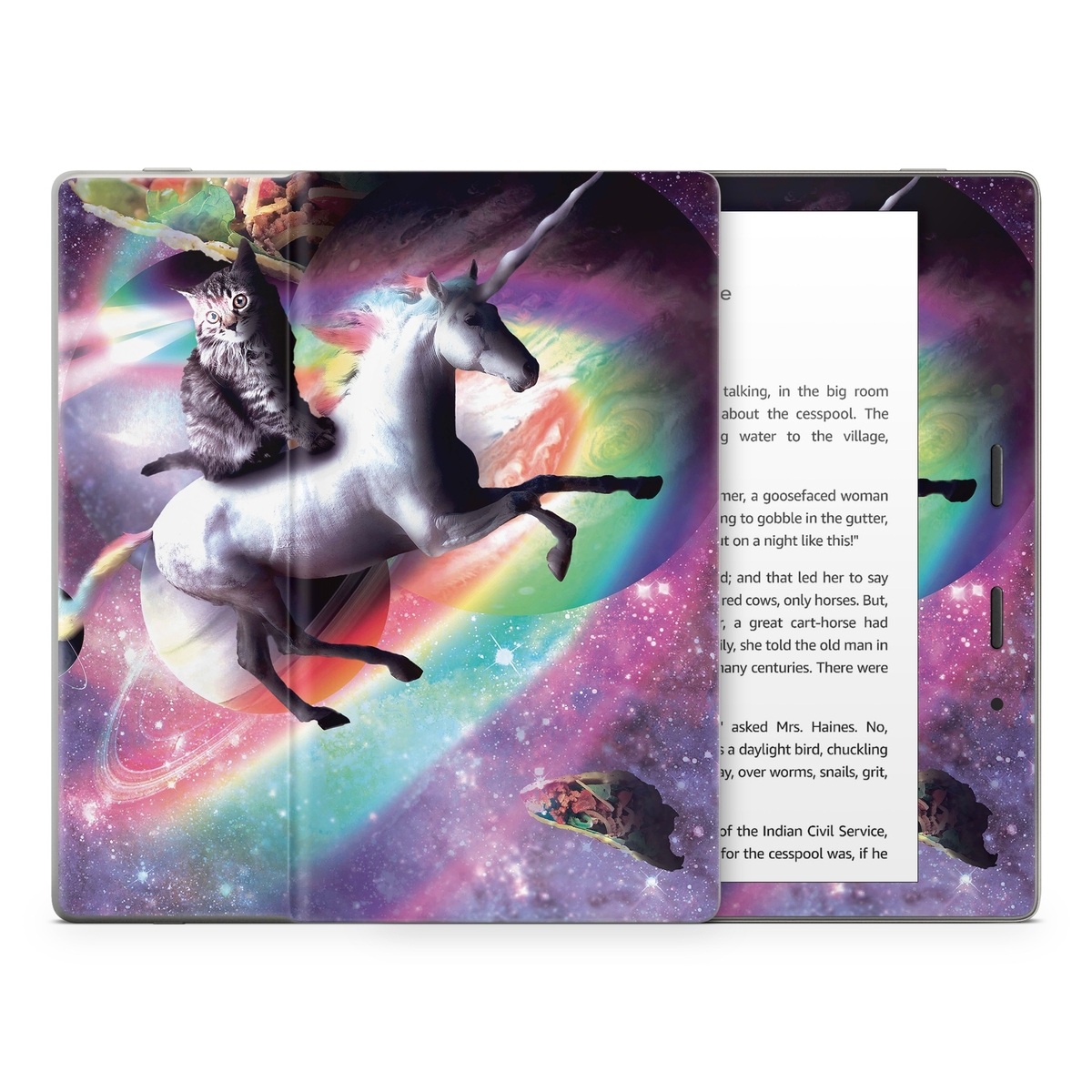 iStyles Amazon Kindle Series Skin design of Illustration, Graphic design, Fictional character, Space, Sky, Astronomical object, Universe, Outer space, Art, Unicorn, with black, white, gray, red, yellow, green, blue, orange colors, and tagged with space, animals, fantasy, animals, funny, galaxy, lasers, random, space, weird.