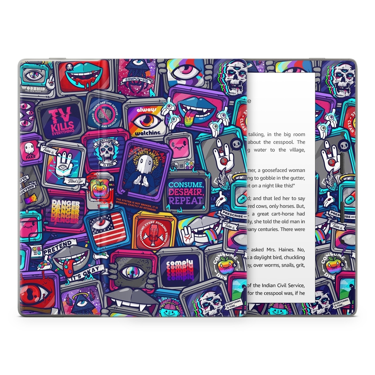 iStyles Amazon Kindle Series Skin design of Pattern, Font, Art, Visual arts, Collection, with red, blue, black, gray, purple, yellow, white, green colors, and tagged with patterns, objects, signs, skulls, illustration, modern, skull, tattoo, thenewgods, tv, vector.