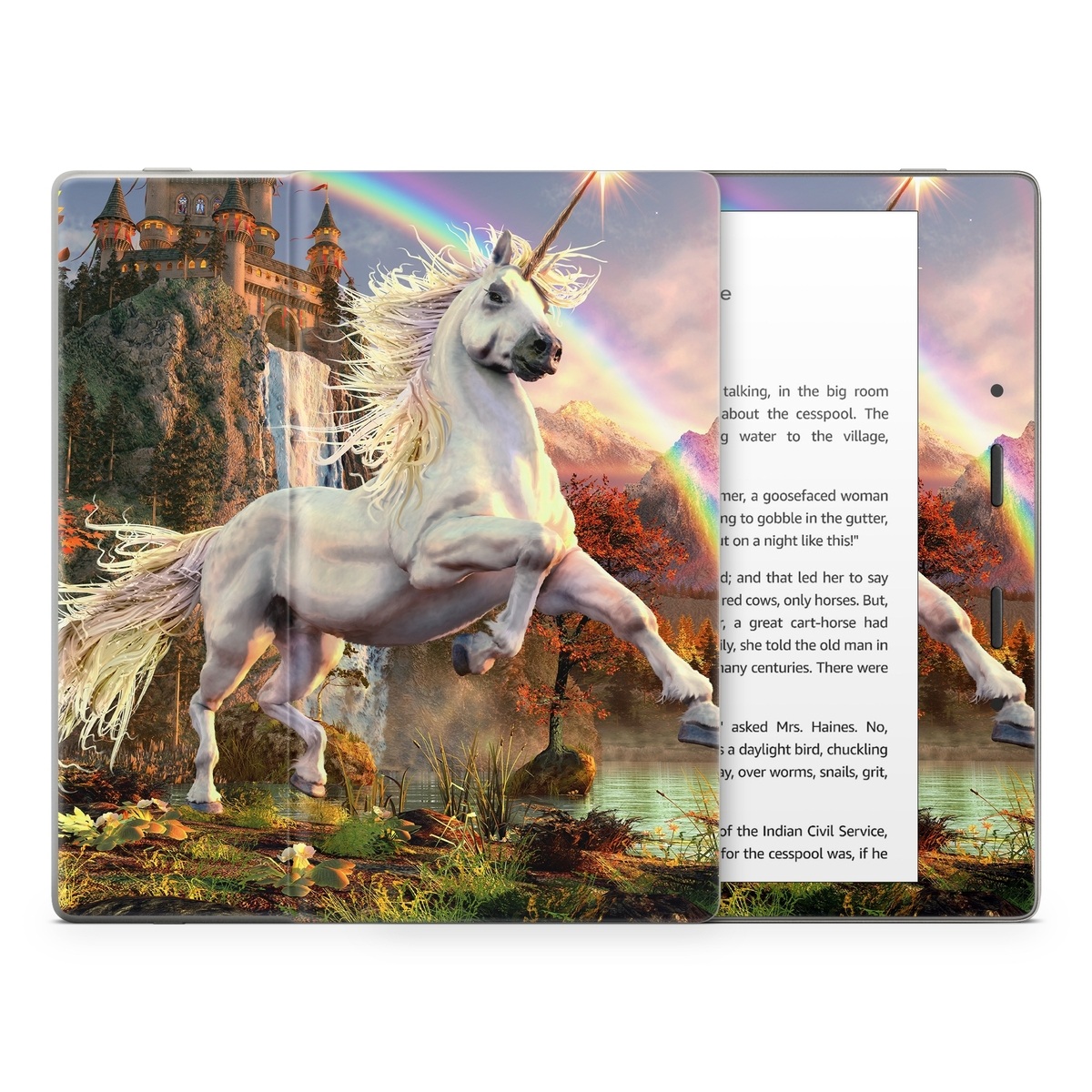 iStyles Amazon Kindle Series Skin design of Nature, Unicorn, Fictional character, Sky, Mythical creature, Mythology, Cg artwork, Horse, Mane, Wildlife, with black, gray, red, green, blue colors, and tagged with animals, fantasy, nature, urban.