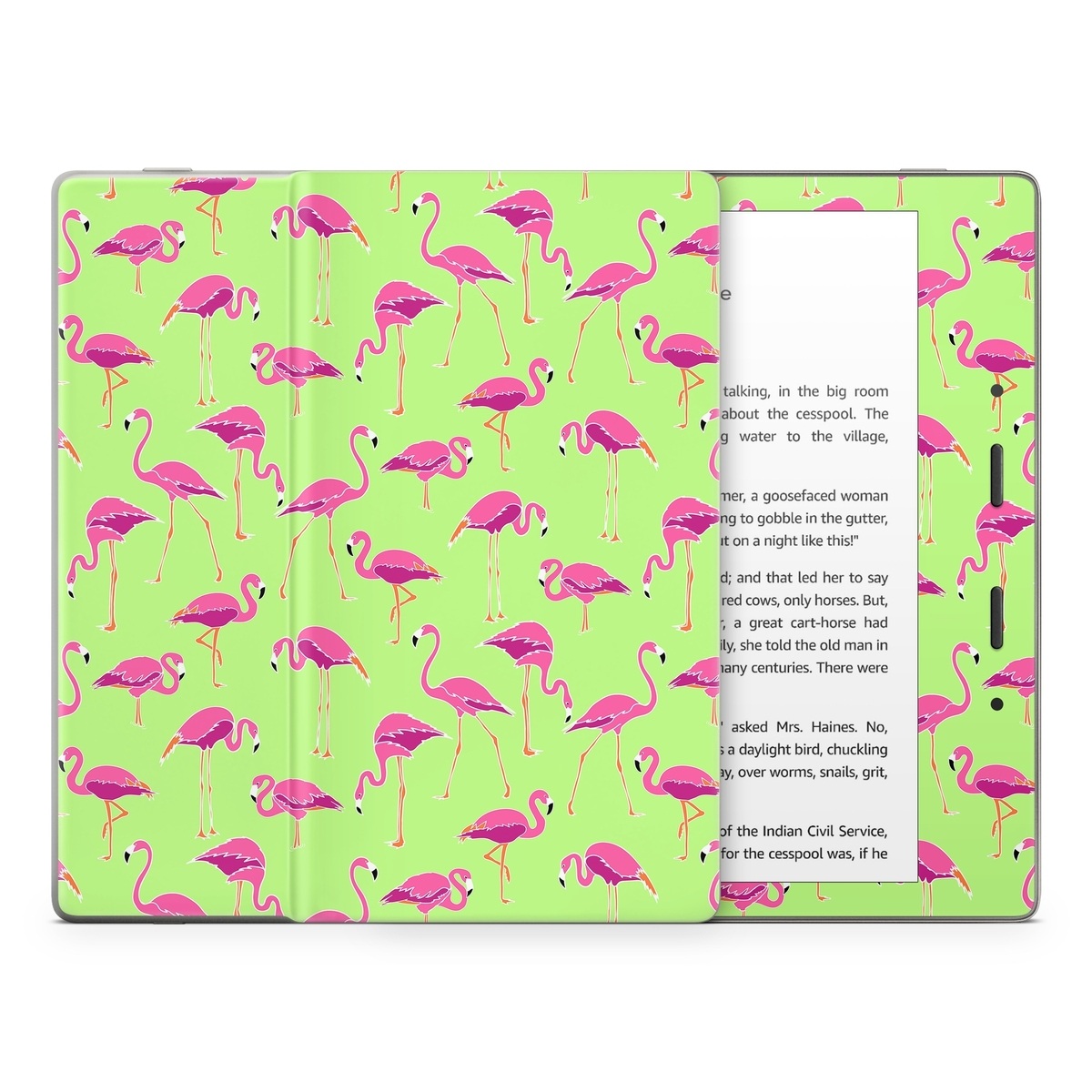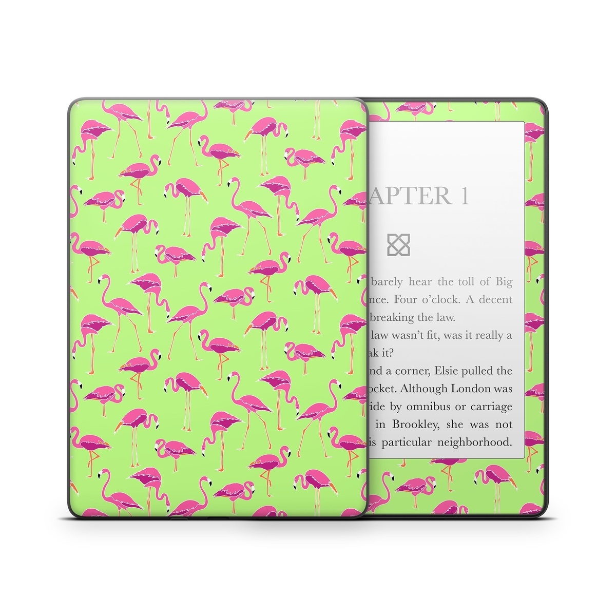 iStyles Amazon Kindle Series Skin design of Pink, Green, Red, Pattern, Wrapping paper, Textile, Design, Flamingo, Line, with pink, green colors, and tagged with patterns, animals, animals, birds, flamingo, nature.