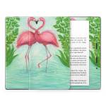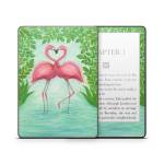 iStyles Amazon Kindle Series Skin design of Flamingo, Greater flamingo, Bird, Water bird, Pink, Illustration, Watercolor paint, Organism, Drawing, Stork, with pink, blue, green colors, and tagged with fineart, animals, hearts, nature, animals, birds, flamingo, tropical, tropics.