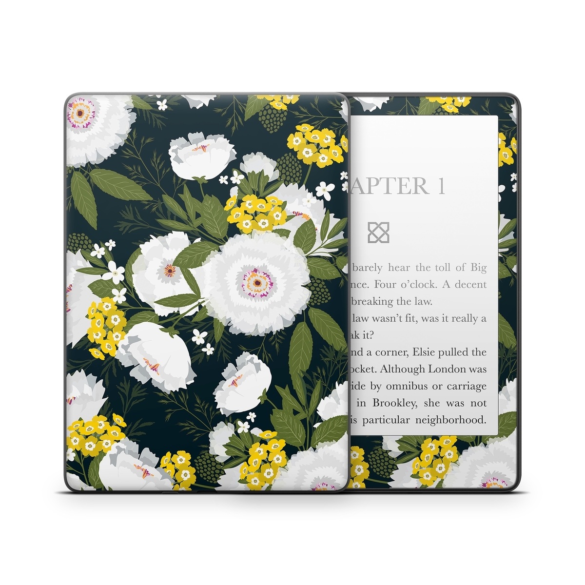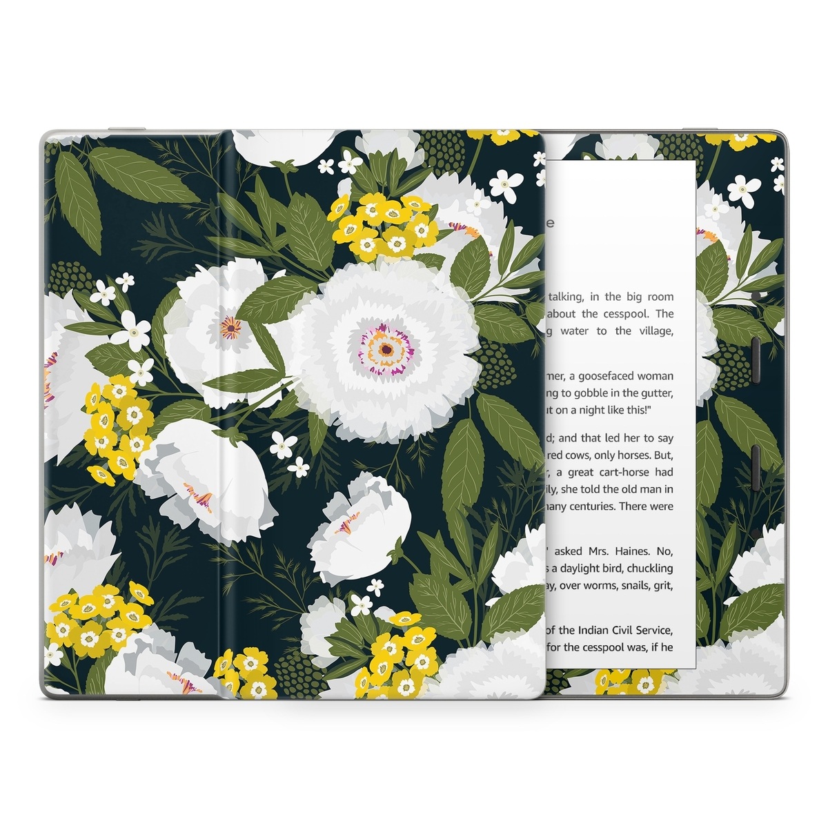 iStyles Amazon Kindle Series Skin design of Flower, Flowering plant, Plant, Petal, Daisy, mayweed, Wildflower, Floral design, Annual plant, with green, yellow, white, orange colors, and tagged with patterns, flowers, filigree, floral, flower, flowers, pattern.